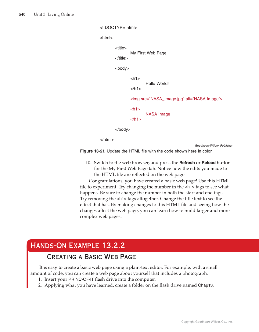 Copyright Goodheart-Willcox Co., Inc. 540 Unit 3 Living Online 10. Switch to the web browser, and press the Refresh or Reload button for the My First Web Page tab. Notice how the edits you made to the HTML fi le are refl ected on the web page. Congratulations, you have created a basic web page! Use this HTML fi le to experiment. Try changing the number in the h1 tags to see what happens. Be sure to change the number in both the start and end tags. Try removing the h1 tags altogether. Change the title text to see the effect that has. By making changes to this HTML fi le and seeing how the changes affect the web page, you can learn how to build larger and more complex web pages. ! DOCTYPE html html title My First Web Page /title body h1 Hello World! /h1 img src=“NASA_Image.jpg” alt=“NASA Image” h1 NASA Image /h1 /body /html Goodheart-Willcox Publisher Figure 13-21. Update the HTML file with the code shown here in color. Hands-On Example 13.2.2 Creating a Basic Web Page It is easy to create a basic web page using a plain-text editor. For example, with a small amount of code, you can create a web page about yourself that includes a photograph. 1. Insert your PRINC-OF-IT fl ash drive into the computer. 2. Applying what you have learned, create a folder on the fl ash drive named Chap13.