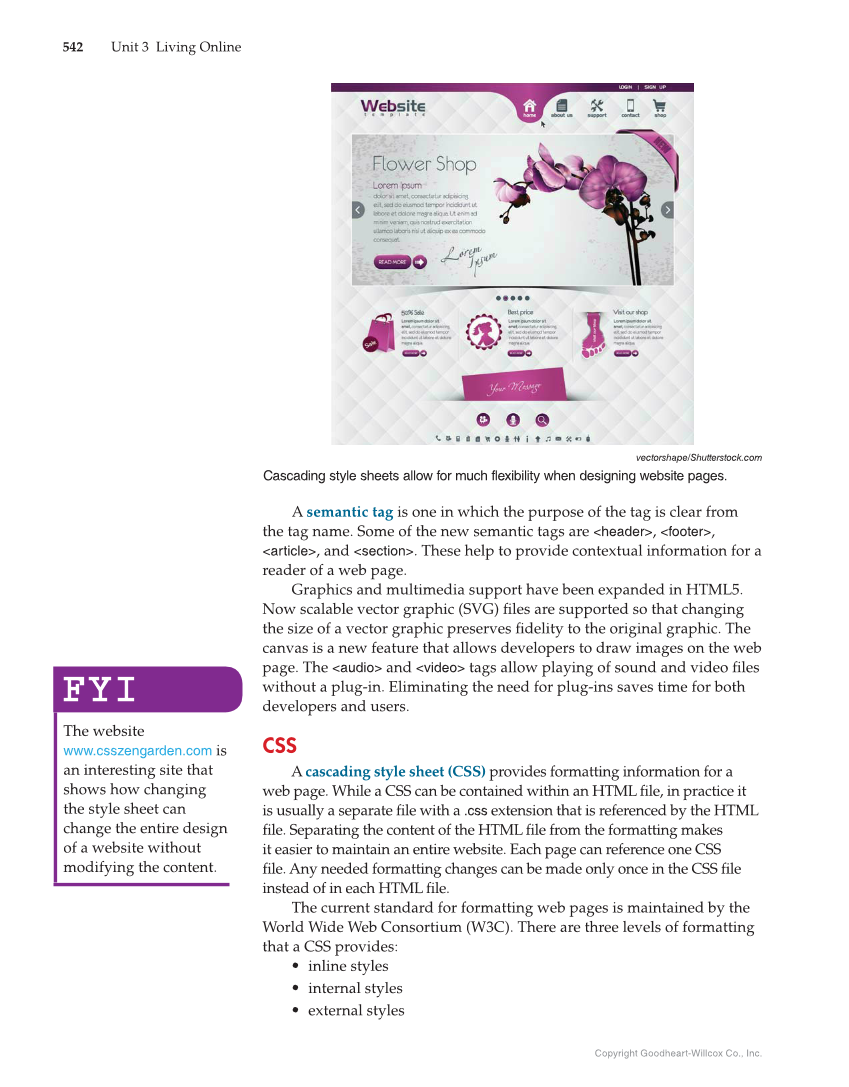 Copyright Goodheart-Willcox Co., Inc. 542 Unit 3 Living Online A semantic tag is one in which the purpose of the tag is clear from the tag name. Some of the new semantic tags are header, footer, article, and section. These help to provide contextual information for a reader of a web page. Graphics and multimedia support have been expanded in HTML5. Now scalable vector graphic (SVG) fi les are supported so that changing the size of a vector graphic preserves fi delity to the original graphic. The canvas is a new feature that allows developers to draw images on the web page. The audio and video tags allow playing of sound and video fi les without a plug-in. Eliminating the need for plug-ins saves time for both developers and users. CSS A cascading style sheet (CSS) provides formatting information for a web page. While a CSS can be contained within an HTML fi le, in practice it is usually a separate fi le with a .css extension that is referenced by the HTML fi le. Separating the content of the HTML fi le from the formatting makes it easier to maintain an entire website. Each page can reference one CSS fi le. Any needed formatting changes can be made only once in the CSS fi le instead of in each HTML fi le. The current standard for formatting web pages is maintained by the World Wide Web Consortium (W3C). There are three levels of formatting that a CSS provides: • inline styles • internal styles • external styles FYI FYI The website www.csszengarden.com is an interesting site that shows how changing the style sheet can change the entire design of a website without modifying the content. vectorshape/Shutterstock.com Cascading style sheets allow for much flexibility when designing website pages.