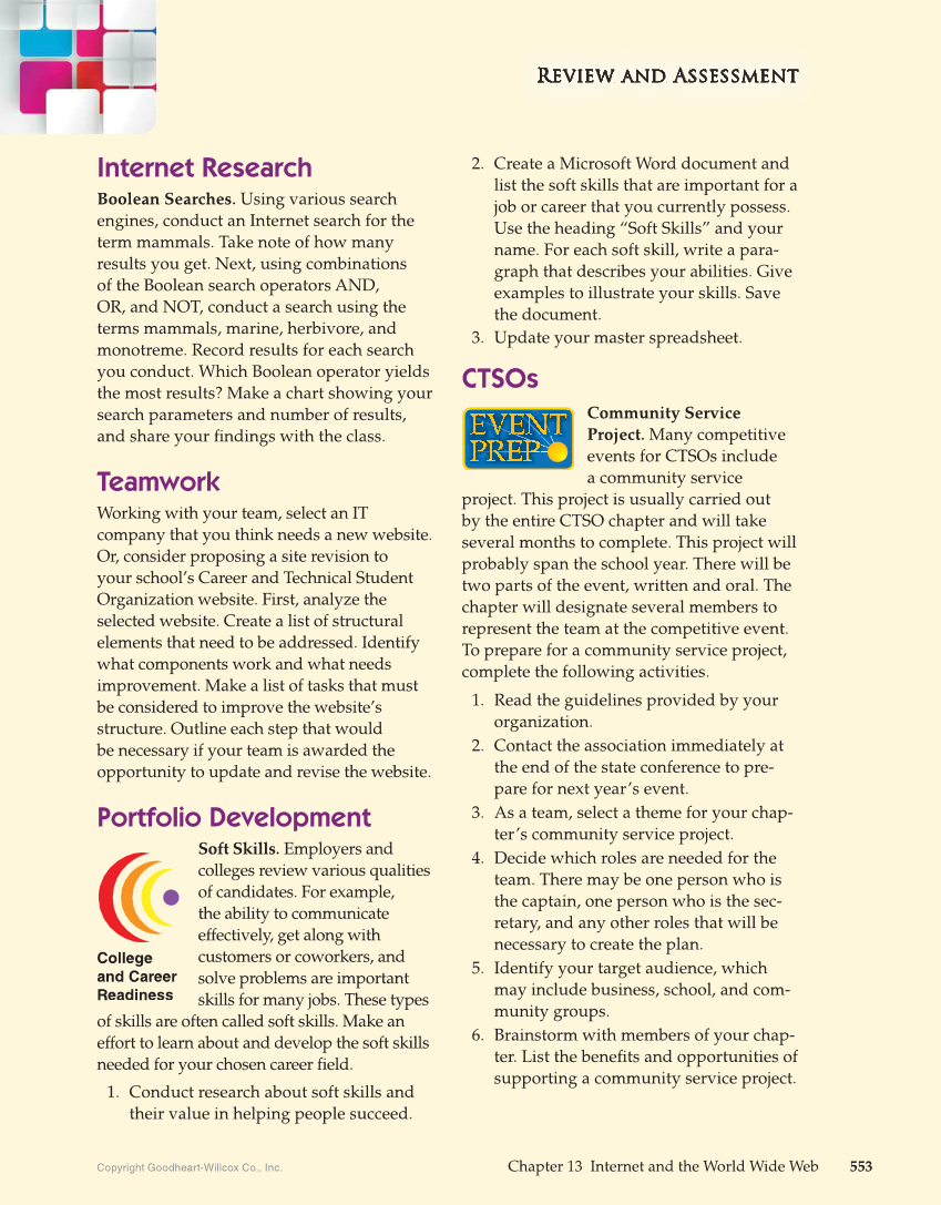 Review and AssessmenttnemssessA Review R R R e v e w w and a a n d d A A A s s e s s m e n n t t t R R R e e i e e w w w a a d d A A s s s s e e s s s s e e t t t i e e w w w a a a n n d d A A A s s s s e e s s s s m m e e n n n t t t R R R R e e v i w w s R R eview and Assessment Chapter 13 Internet and the World Wide Web 553 Copyright Goodheart-Willcox Co., Inc. Internet Research Boolean Searches. Using various search engines, conduct an Internet search for the term mammals. Take note of how many results you get. Next, using combinations of the Boolean search operators AND, OR, and NOT, conduct a search using the terms mammals, marine, herbivore, and monotreme. Record results for each search you conduct. Which Boolean operator yields the most results? Make a chart showing your search parameters and number of results, and share your fi ndings with the class. Teamwork Working with your team, select an IT company that you think needs a new website. Or, consider proposing a site revision to your school’s Career and Technical Student Organization website. First, analyze the selected website. Create a list of structural elements that need to be addressed. Identify what components work and what needs improvement. Make a list of tasks that must be considered to improve the website’s structure. Outline each step that would be necessary if your team is awarded the opportunity to update and revise the website. Portfolio Development Soft Skills. Employers and colleges review various qualities of candidates. For example, the ability to communicate effectively, get along with customers or coworkers, and solve problems are important skills for many jobs. These types of skills are often called soft skills. Make an effort to learn about and develop the soft skills needed for your chosen career fi eld. 1. Conduct research about soft skills and their value in helping people succeed. College and Career Readiness 2. Create a Microsoft Word document and list the soft skills that are important for a job or career that you currently possess. Use the heading “Soft Skills” and your name. For each soft skill, write a para- graph that describes your abilities. Give examples to illustrate your skills. Save the document. 3. Update your master spreadsheet. CTSOs Community Service Project. Many competitive events for CTSOs include a community service project. This project is usually carried out by the entire CTSO chapter and will take several months to complete. This project will probably span the school year. There will be two parts of the event, written and oral. The chapter will designate several members to represent the team at the competitive event. To prepare for a community service project, complete the following activities. 1. Read the guidelines provided by your organization. 2. Contact the association immediately at the end of the state conference to pre- pare for next year’s event. 3. As a team, select a theme for your chap- ter’s community service project. 4. Decide which roles are needed for the team. There may be one person who is the captain, one person who is the sec- retary, and any other roles that will be necessary to create the plan. 5. Identify your target audience, which may include business, school, and com- munity groups. 6. Brainstorm with members of your chap- ter. List the benefi ts and opportunities of supporting a community service project. N EVENT E E E E E V N N N N N N N T T PREP P P P P P P R R E P P P P P P P EVENT PREP T N N N N N N N N N N N N N N N N N N N N N N V V V V V N N N N N N T T T T V N N N N E E E E E E E E V V V V V V V V V V V V E E E E E E E E E N N N N N N N N N N N N T T T T T T T T T T T T EVENT E E E E E E E E E E E E E E E E E E E E E E E E E E E E E E E E E E E E E E E E V V V V V V V V V V V V V V V V V V V V V V V V V V V V V V V V V V V V V V E E E E E E E E E E E E E E E E E E E E E E E E N N N N N N N N N N N N N N N N N N N N N N N N N N N N N N N N N N N N N N N N N N N N N N N N N N N N N N T T T T T T T T T T T T T T T T T T T T T T T T T T T T T T T T T T T T T T T T T T T T E E E V V V E E E N N N T T T V V V V V V V V T T N E E E V V E E E N N P P P P P P P P P P R R R R R R R R E E E E E P P P P P P P P P P P P P P P P P P R R R R R R R P P P P R P R P P P P P P P P P P P P R R R R R R R R R R R R E E E E E E P P P P P P P P P P P P PREP P P P P P P P P P P P P P P P P P P P P P P P P P P P P P P P P P P P P P P P P P P P P P P P R R R R R R R R R R R R R R R R R R R R R R R R R R R R R R R R R R R E E E E E E E E E E E E E E E E E E E E E P P P P P P P P P P P P P P P P P P P P P P P P P P P P P P P P P P P P P P P P P P P P P P P P P R R R E E E P P P PRE P PREP P P P P P P P P P P P P R R R R R R R R R R R R R E E E E E E E E E P P P P P P P P P P P R R R E E E P P P P P P P P P P P P P P P P P P P P P P P P P P P P P P P P P P P P P P P R R R E E E P