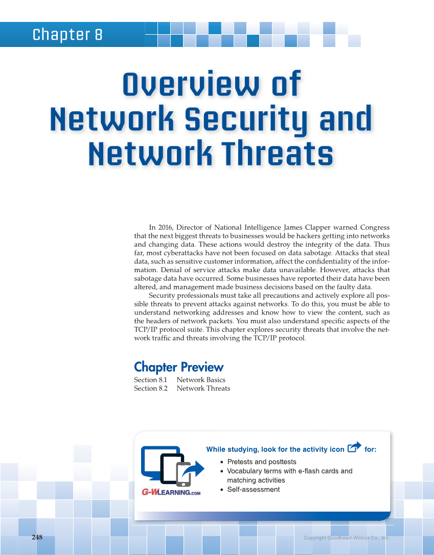 248 Copyright Goodheart-Willcox Co., Inc. • Pretests and posttests • Vocabulary terms with e-flash cards and matching activities • Self-assessment While studying, look for the activity icon for: Overview of Network Security and Network Threats Chapter 8 In 2016, Director of National Intelligence James Clapper warned Congress that the next biggest threats to businesses would be hackers getting into networks and changing data. These actions would destroy the integrity of the data. Thus far, most cyberattacks have not been focused on data sabotage. Attacks that steal data, such as sensitive customer information, affect the confi dentiality of the infor- mation. Denial of service attacks make data unavailable. However, attacks that sabotage data have occurred. Some businesses have reported their data have been altered, and management made business decisions based on the faulty data. Security professionals must take all precautions and actively explore all pos- sible threats to prevent attacks against networks. To do this, you must be able to understand networking addresses and know how to view the content, such as the headers of network packets. You must also understand specifi c aspects of the TCP/IP protocol suite. This chapter explores security threats that involve the net- work traffi c and threats involving the TCP/IP protocol. Chapter Preview Section 8.1 Network Basics Section 8.2 Network Threats