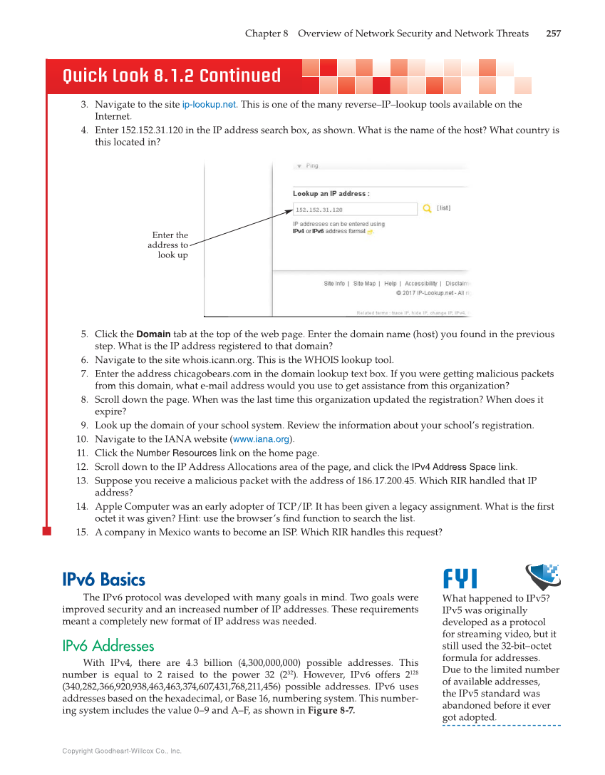 Copyright Goodheart-Willcox Co., Inc. Chapter 8 Overview of Network Security and Network Threats 257 Quick Look 8.1.2 Continued 3. Navigate to the site ip-lookup.net. This is one of the many reverse–IP–lookup tools available on the Internet. 4. Enter 152.152.31.120 in the IP address search box, as shown. What is the name of the host? What country is this located in? 5. Click the Domain tab at the top of the web page. Enter the domain name (host) you found in the previous step. What is the IP address registered to that domain? 6. Navigate to the site whois.icann.org. This is the WHOIS lookup tool. 7. Enter the address chicagobears.com in the domain lookup text box. If you were getting malicious packets from this domain, what e-mail address would you use to get assistance from this organization? 8. Scroll down the page. When was the last time this organization updated the registration? When does it expire? 9. Look up the domain of your school system. Review the information about your school’s registration. 10. Navigate to the IANA website (www.iana.org). 11. Click the Number Resources link on the home page. 12. Scroll down to the IP Address Allocations area of the page, and click the IPv4 Address Space link. 13. Suppose you receive a malicious packet with the address of 186.17.200.45. Which RIR handled that IP address? 14. Apple Computer was an early adopter of TCP/IP. It has been given a legacy assignment. What is the fi rst octet it was given? Hint: use the browser’s fi nd function to search the list. 15. A company in Mexico wants to become an ISP. Which RIR handles this request? Enter the address to look up IPv6 Basics The IPv6 protocol was developed with many goals in mind. Two goals were improved security and an increased number of IP addresses. These requirements meant a completely new format of IP address was needed. IPv6 Addresses With IPv4, there are 4.3 billion (4,300,000,000) possible addresses. This number is equal to 2 raised to the power 32 (232). However, IPv6 offers 2128 (340,282,366,920,938,463,463,374,607,431,768,211,456) possible addresses. IPv6 uses addresses based on the hexadecimal, or Base 16, numbering system. This number- ing system includes the value 0–9 and A–F, as shown in Figure 8-7. What happened to IPv5? IPv5 was originally developed as a protocol for streaming video, but it still used the 32-bit–octet formula for addresses. Due to the limited number of available addresses, the IPv5 standard was abandoned before it ever got adopted. FYI