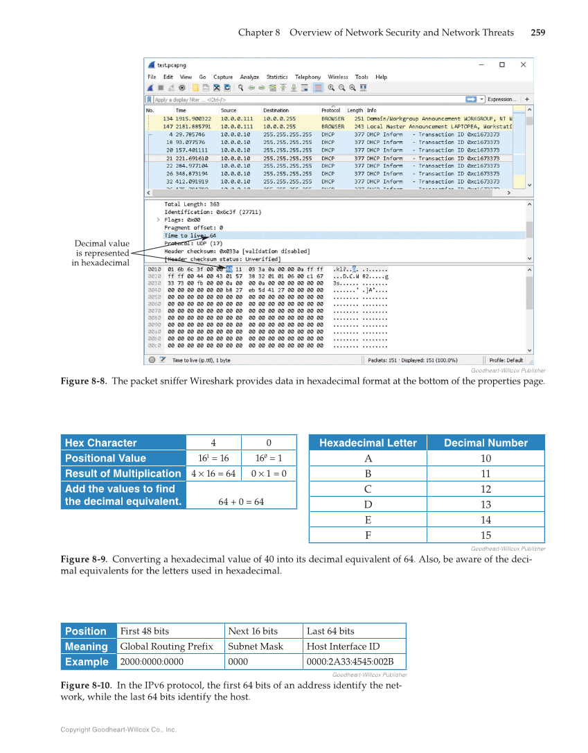 Copyright Goodheart-Willcox Co., Inc. Chapter 8 Overview of Network Security and Network Threats 259 Decimal value is represented in hexadecimal Goodheart-Willcox Publisher Figure 8-8. The packet sniffer Wireshark provides data in hexadecimal format at the bottom of the properties page. Goodheart-Willcox Publisher Figure 8-9. Converting a hexadecimal value of 40 into its decimal equivalent of 64. Also, be aware of the deci- mal equivalents for the letters used in hexadecimal. Hex Character 4 0 Positional Value 161 = 16 160 = 1 Result of Multiplication 4 × 16 = 64 0 × 1 = 0 Add the values to find the decimal equivalent. 64 + 0 = 64 Hexadecimal Letter Decimal Number A 10 B 11 C 12 D 13 E 14 F 15 Goodheart-Willcox Publisher Figure 8-10. In the IPv6 protocol, the first 64 bits of an address identify the net- work, while the last 64 bits identify the host. Position First 48 bits Next 16 bits Last 64 bits Meaning Global Routing Prefix Subnet Mask Host Interface ID Example 2000:0000:0000 0000 0000:2A33:4545:002B