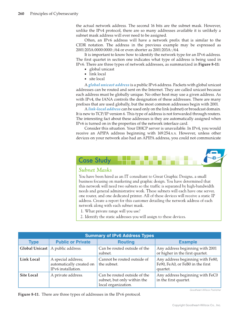 Copyright Goodheart-Willcox Co., Inc. 260 Principles of Cybersecurity the actual network address. The second 16 bits are the subnet mask. However, unlike the IPv4 protocol, there are so many addresses available it is unlikely a subnet mask address will ever need to be assigned. Often, an IPv6 address will have a network prefi x that is similar to the CIDR notation. The address in the previous example may be expressed as 2001:203A:0000:0000::/64 or even shorter as 2001:203A::/64. It is important to know how to identify the network type for an IPv6 address. The fi rst quartet in section one indicates what type of address is being used in IPv6. There are three types of network addresses, as summarized in Figure 8-11: • global unicast • link local • site local A global unicast address is a public IPv6 address. Packets with global unicast addresses can be routed and sent on the Internet. They are called unicast because each address must be globally unique. No other host may use a given address. As with IPv4, the IANA controls the designation of these addresses. There are many prefi xes that are used globally, but the most common addresses begin with 2001. A link-local address can be used only on the link (subnet) or broadcast domain. It is new to TCP/IP version 6. This type of address is not forwarded through routers. The interesting fact about these addresses is they are automatically assigned when IPv6 is turned on in the properties of the network interface card. Consider this situation. Your DHCP server is unavailable. In IPv4, you would receive an APIPA address beginning with 169.254.x.x. However, unless other devices on your network also had an APIPA address, you could not communicate Subnet Masks You have been hired as an IT consultant to Great Graphic Designs, a small business focusing on marketing and graphic design. You have determined that this network will need two subnets so the traffic is separated by high-bandwidth needs and general administrative work. These subnets will each have one server, one router, and one dedicated printer. All of these devices will receive a static IP address. Create a report for this customer detailing the network address of each network along with each subnet mask. 1. What private range will you use? 2. Identify the static addresses you will assign to these devices. Case Study Goodheart-Willcox Publisher Figure 8-11. There are three types of addresses in the IPv6 protocol. Summary of IPv6 Address Types Type Public or Private Routing Example Global Unicast A public address. Can be routed outside of the subnet. Any address beginning with 2001 or higher in the first quartet. Link Local A special address automatically created on IPv6 installation. Cannot be routed outside of the subnet. Any address beginning with Fe80, Fe90, FeA0, or FeB0 in the first quartet. Site Local A private address. Can be routed outside of the subnet, but only within the local organization. Any address beginning with FeC0 in the first quartet.
