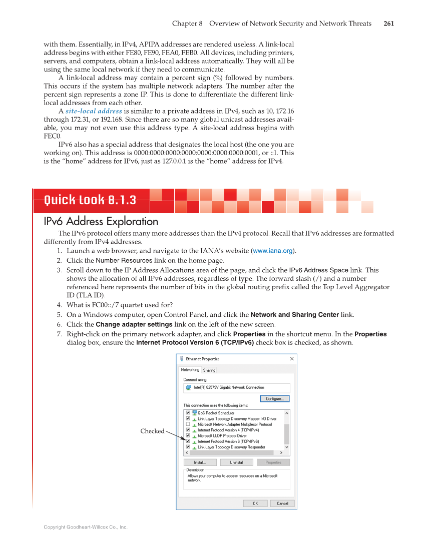 Copyright Goodheart-Willcox Co., Inc. Chapter 8 Overview of Network Security and Network Threats 261 with them. Essentially, in IPv4, APIPA addresses are rendered useless. A link-local address begins with either FE80, FE90, FEA0, FEB0. All devices, including printers, servers, and computers, obtain a link-local address automatically. They will all be using the same local network if they need to communicate. A link-local address may contain a percent sign (%) followed by numbers. This occurs if the system has multiple network adapters. The number after the percent sign represents a zone IP. This is done to differentiate the different link- local addresses from each other. A site-local address is similar to a private address in IPv4, such as 10, 172.16 through 172.31, or 192.168. Since there are so many global unicast addresses avail- able, you may not even use this address type. A site-local address begins with FEC0. IPv6 also has a special address that designates the local host (the one you are working on). This address is 0000:0000:0000:0000:0000:0000:0000:0001, or ::1. This is the “home” address for IPv6, just as 127.0.0.1 is the “home” address for IPv4. Quick Look 8.1.3 IPv6 Address Exploration The IPv6 protocol offers many more addresses than the IPv4 protocol. Recall that IPv6 addresses are formatted differently from IPv4 addresses. 1. Launch a web browser, and navigate to the IANA’s website (www.iana.org). 2. Click the Number Resources link on the home page. 3. Scroll down to the IP Address Allocations area of the page, and click the IPv6 Address Space link. This shows the allocation of all IPv6 addresses, regardless of type. The forward slash (/) and a number referenced here represents the number of bits in the global routing prefi x called the Top Level Aggregator ID (TLA ID). 4. What is FC00::/7 quartet used for? 5. On a Windows computer, open Control Panel, and click the Network and Sharing Center link. 6. Click the Change adapter settings link on the left of the new screen. 7. Right-click on the primary network adapter, and click Properties in the shortcut menu. In the Properties dialog box, ensure the Internet Protocol Version 6 (TCP/IPv6) check box is checked, as shown. Checked