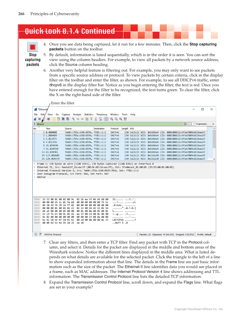 Copyright Goodheart-Willcox Co., Inc. 266 Principles of Cybersecurity Quick Look 8.1.4 Continued 4. Once you see data being captured, let it run for a few minutes. Then, click the Stop capturing packets button on the toolbar. 5. By default, information is listed sequentially, which is in the order it is seen. You can sort the view using the column headers. For example, to view all packets by a network source address, click the Source column heading. 6. Another very helpful feature is fi ltering out. For example, you may only want to see packets from a specifi c source address or protocol. To view packets by certain criteria, click in the display fi lter on the toolbar and enter the fi lter, as shown. For example, to see all DHCPv6 traffi c, enter dhcpv6 in the display fi lter bar. Notice as you begin entering the fi lter, the text is red. Once you have entered enough for the fi lter to be recognized, the text turns green. To clear the fi lter, click the X on the right-hand side of the fi lter. 7. Clear any fi lters, and then enter a TCP fi lter. Find any packet with TCP in the Protocol col- umn, and select it. Details for the packet are displayed in the middle and bottom areas of the Wireshark window. Notice the different lines displayed in the middle area. What is listed de- pends on what details are available for the selected packet. Click the triangle to the left of a line to show expanded information about that line. The details in the Frame line are just basic infor- mation such as the size of the packet. The Ethernet II line identifi es data you would see placed in a frame, such as MAC addresses. The Internet Protocol Version 4 line shows addressing and TTL information. The Transmission Control Protocol line lists the detailed TCP information. 8. Expand the Transmission Control Protocol line, scroll down, and expand the Flags line. What fl ags are set in your example? Stop capturing packets Enter the filter