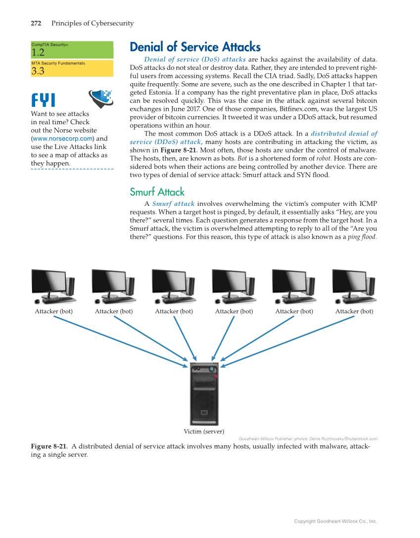 Copyright Goodheart-Willcox Co., Inc. 272 Principles of Cybersecurity Denial of Service Attacks Denial of service (DoS) attacks are hacks against the availability of data. DoS attacks do not steal or destroy data. Rather, they are intended to prevent right- ful users from accessing systems. Recall the CIA triad. Sadly, DoS attacks happen quite frequently. Some are severe, such as the one described in Chapter 1 that tar- geted Estonia. If a company has the right preventative plan in place, DoS attacks can be resolved quickly. This was the case in the attack against several bitcoin exchanges in June 2017. One of those companies, Bitfi nex.com, was the largest US provider of bitcoin currencies. It tweeted it was under a DDoS attack, but resumed operations within an hour. The most common DoS attack is a DDoS attack. In a distributed denial of service (DDoS) attack, many hosts are contributing in attacking the victim, as shown in Figure 8-21. Most often, those hosts are under the control of malware. The hosts, then, are known as bots. Bot is a shortened form of robot. Hosts are con- sidered bots when their actions are being controlled by another device. There are two types of denial of service attack: Smurf attack and SYN fl ood. Smurf Attack A Smurf attack involves overwhelming the victim’s computer with ICMP requests. When a target host is pinged, by default, it essentially asks “Hey, are you there?” several times. Each question generates a response from the target host. In a Smurf attack, the victim is overwhelmed attempting to reply to all of the “Are you there?” questions. For this reason, this type of attack is also known as a ping fl ood. CompTIA Security+ 1.2 MTA Security Fundamentals 3.3 Want to see attacks in real time? Check out the Norse website (www.norsecorp.com) and use the Live Attacks link to see a map of attacks as they happen. FYI Attacker (bot) Attacker (bot) Attacker (bot) Attacker (bot) Attacker (bot) Attacker (bot) Victim (server) Goodheart-Willcox Publisher photos: Denis Rozhnovsky/Shutterstock.com Figure 8-21. A distributed denial of service attack involves many hosts, usually infected with malware, attack- ing a single server.