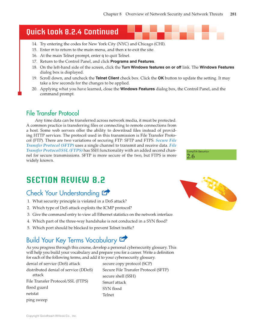Copyright Goodheart-Willcox Co., Inc. Chapter 8 Overview of Network Security and Network Threats 281 Quick Look 8.2.4 Continued 14. Try entering the codes for New York City (NYC) and Chicago (CHI). 15. Enter m to return to the main menu, and then x to exit the site. 16. At the main Telnet prompt, enter q to quit Telnet. 17. Return to the Control Panel, and click Programs and Features. 18. On the left-hand side of the screen, click the Turn Windows features on or off link. The Windows Features dialog box is displayed. 19. Scroll down, and uncheck the Telnet Client check box. Click the OK button to update the setting. It may take a few seconds for the changes to be applied. 20. Applying what you have learned, close the Windows Features dialog box, the Control Panel, and the command prompt. File Transfer Protocol Any time data can be transferred across network media, it must be protected. A common practice is transferring fi les or connecting to remote connections from a host. Some web servers offer the ability to download fi les instead of provid- ing HTTP services. The protocol used in this transmission is File Transfer Proto- col (FTP). There are two variations of securing FTP: SFTP and FTPS. Secure File Transfer Protocol (SFTP) uses a single channel to transmit and receive data. File Transfer Protocol/SSL (FTPS) has SSH functionality with an added second chan- nel for secure transmissions. SFTP is more secure of the two, but FTPS is more widely known. SECTION REVIEW 8.2 Check Your Understanding 1. What security principle is violated in a DoS attack? 2. Which type of DoS attack exploits the ICMP protocol? 3. Give the command entry to view all Ethernet statistics on the network interface. 4. Which part of the three-way handshake is not conducted in a SYN fl ood? 5. Which port should be blocked to prevent Telnet traffi c? Build Your Key Terms Vocabulary As you progress through this course, develop a personal cybersecurity glossary. This will help you build your vocabulary and prepare you for a career. Write a defi nition for each of the following terms, and add it to your cybersecurity glossary. denial of service (DoS) attack distributed denial of service (DDoS) attack File Transfer Protocol/SSL (FTPS) fl ood guard netstat ping sweep secure copy protocol (SCP) Secure File Transfer Protocol (SFTP) secure shell (SSH) Smurf attack SYN fl ood Telnet CompTIA Security+ 2.6