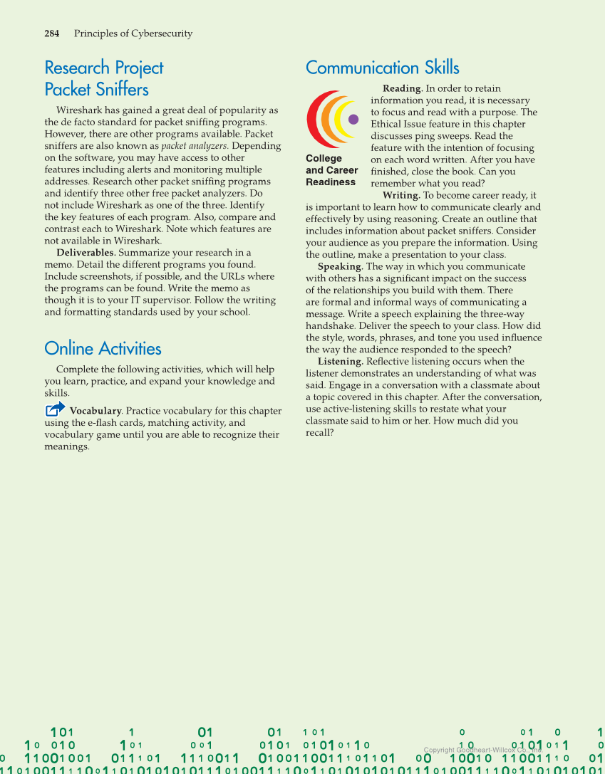 Copyright Goodheart-Willcox Co., Inc. 284 Principles of Cybersecurity Research Project Packet Sniffers Wireshark has gained a great deal of popularity as the de facto standard for packet sniffi ng programs. However, there are other programs available. Packet sniffers are also known as packet analyzers. Depending on the software, you may have access to other features including alerts and monitoring multiple addresses. Research other packet sniffi ng programs and identify three other free packet analyzers. Do not include Wireshark as one of the three. Identify the key features of each program. Also, compare and contrast each to Wireshark. Note which features are not available in Wireshark. Deliverables. Summarize your research in a memo. Detail the different programs you found. Include screenshots, if possible, and the URLs where the programs can be found. Write the memo as though it is to your IT supervisor. Follow the writing and formatting standards used by your school. Online Activities Complete the following activities, which will help you learn, practice, and expand your knowledge and skills. Vocabulary. Practice vocabulary for this chapter using the e-fl ash cards, matching activity, and vocabulary game until you are able to recognize their meanings. Communication Skills Reading. In order to retain information you read, it is necessary to focus and read with a purpose. The Ethical Issue feature in this chapter discusses ping sweeps. Read the feature with the intention of focusing on each word written. After you have fi nished, close the book. Can you remember what you read? Writing. To become career ready, it is important to learn how to communicate clearly and effectively by using reasoning. Create an outline that includes information about packet sniffers. Consider your audience as you prepare the information. Using the outline, make a presentation to your class. Speaking. The way in which you communicate with others has a signifi cant impact on the success of the relationships you build with them. There are formal and informal ways of communicating a message. Write a speech explaining the three-way handshake. Deliver the speech to your class. How did the style, words, phrases, and tone you used infl uence the way the audience responded to the speech? Listening. Refl ective listening occurs when the listener demonstrates an understanding of what was said. Engage in a conversation with a classmate about a topic covered in this chapter. After the conversation, use active-listening skills to restate what your classmate said to him or her. How much did you recall? College and Career Readiness