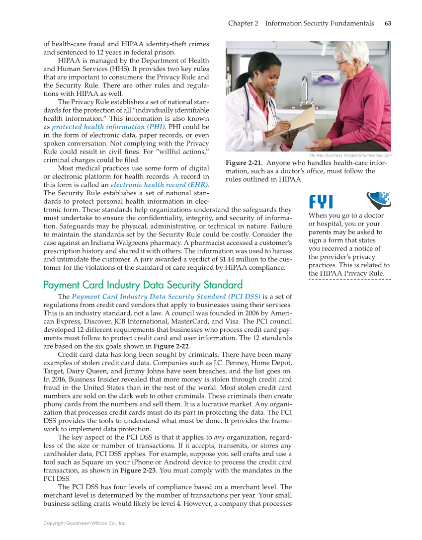 Copyright Goodheart-Willcox Co., Inc. Chapter 2 Information Security Fundamentals 63 of health-care fraud and HIPAA identity-theft crimes and sentenced to 12 years in federal prison. HIPAA is managed by the Department of Health and Human Services (HHS). It provides two key rules that are important to consumers: the Privacy Rule and the Security Rule. There are other rules and regula- tions with HIPAA as well. The Privacy Rule establishes a set of national stan- dards for the protection of all “individually identifi able health information.” This information is also known as protected health information (PHI). PHI could be in the form of electronic data, paper records, or even spoken conversation. Not complying with the Privacy Rule could result in civil fi nes. For “willful actions,” criminal charges could be fi led. Most medical practices use some form of digital or electronic platform for health records. A record in this form is called an electronic health record (EHR). The Security Rule establishes a set of national stan- dards to protect personal health information in elec- tronic form. These standards help organizations understand the safeguards they must undertake to ensure the confi dentiality, integrity, and security of informa- tion. Safeguards may be physical, administrative, or technical in nature. Failure to maintain the standards set by the Security Rule could be costly. Consider the case against an Indiana Walgreens pharmacy. A pharmacist accessed a customer’s prescription history and shared it with others. The information was used to harass and intimidate the customer. A jury awarded a verdict of $1.44 million to the cus- tomer for the violations of the standard of care required by HIPAA compliance. Payment Card Industry Data Security Standard The Payment Card Industry Data Security Standard (PCI DSS) is a set of regulations from credit card vendors that apply to businesses using their services. This is an industry standard, not a law. A council was founded in 2006 by Ameri- can Express, Discover, JCB International, MasterCard, and Visa. The PCI council developed 12 different requirements that businesses who process credit card pay- ments must follow to protect credit card and user information. The 12 standards are based on the six goals shown in Figure 2-22. Credit card data has long been sought by criminals. There have been many examples of stolen credit card data. Companies such as J.C. Penney, Home Depot, Target, Dairy Queen, and Jimmy Johns have seen breaches, and the list goes on. In 2016, Business Insider revealed that more money is stolen through credit card fraud in the United States than in the rest of the world. Most stolen credit card numbers are sold on the dark web to other criminals. These criminals then create phony cards from the numbers and sell them. It is a lucrative market. Any organi- zation that processes credit cards must do its part in protecting the data. The PCI DSS provides the tools to understand what must be done. It provides the frame- work to implement data protection. The key aspect of the PCI DSS is that it applies to any organization, regard- less of the size or number of transactions. If it accepts, transmits, or stores any cardholder data, PCI DSS applies. For example, suppose you sell crafts and use a tool such as Square on your iPhone or Android device to process the credit card transaction, as shown in Figure 2-23. You must comply with the mandates in the PCI DSS. The PCI DSS has four levels of compliance based on a merchant level. The merchant level is determined by the number of transactions per year. Your small business selling crafts would likely be level 4. However, a company that processes When you go to a doctor or hospital, you or your parents may be asked to sign a form that states you received a notice of the provider’s privacy practices. This is related to the HIPAA Privacy Rule. FYI Monkey Business Images/Shutterstock.com Figure 2-21. Anyone who handles health-care infor- mation, such as a doctor’s office, must follow the rules outlined in HIPAA.