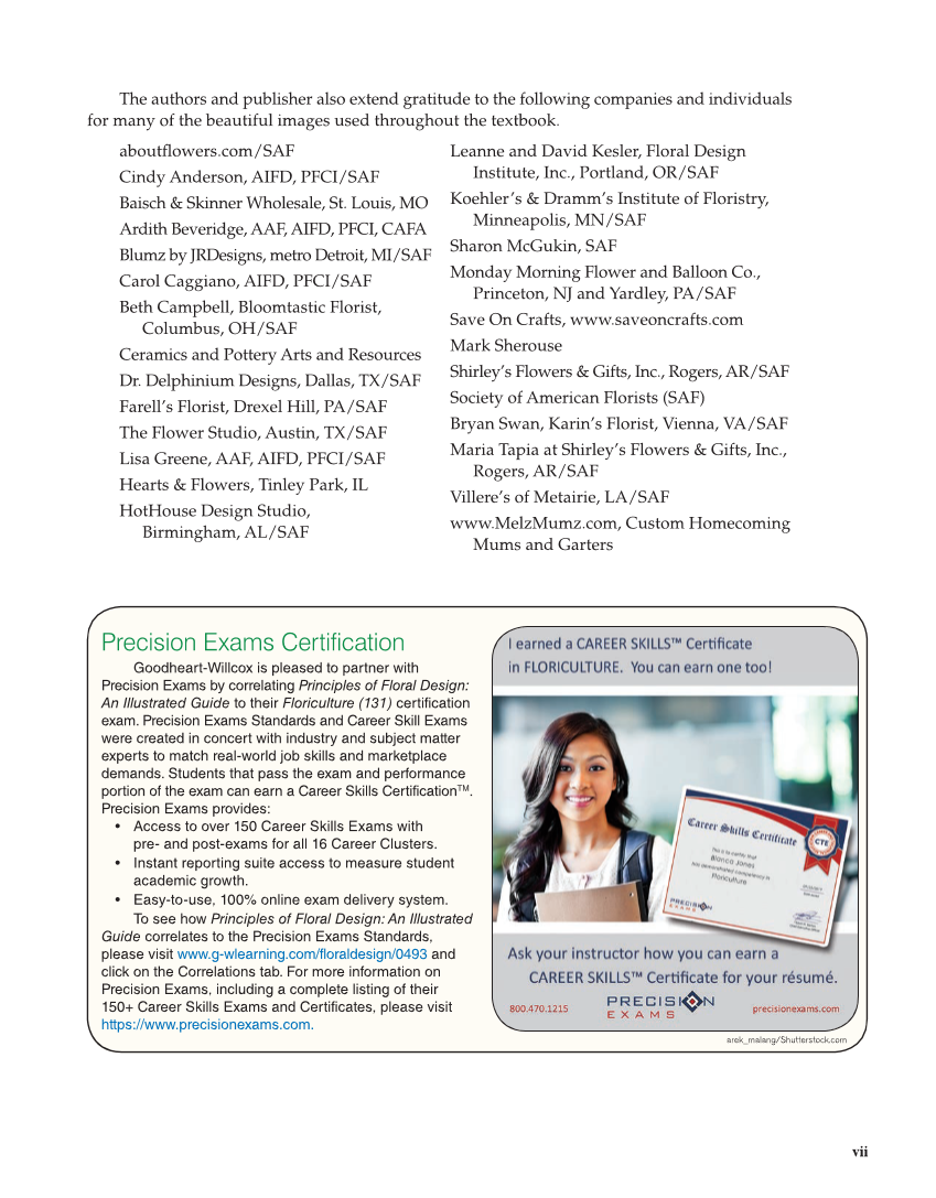 vii The authors and publisher also extend gratitude to the following companies and individuals for many of the beautiful images used throughout the textbook. aboutfl owers.com/SAF Cindy Anderson, AIFD, PFCI/SAF Baisch & Skinner Wholesale, St. Louis, MO Ardith Beveridge, AAF, AIFD, PFCI, CAFA Blumz by JRDesigns, metro Detroit, MI/SAF Carol Caggiano, AIFD, PFCI/SAF Beth Campbell, Bloomtastic Florist, Columbus, OH/SAF Ceramics and Pottery Arts and Resources Dr. Delphinium Designs, Dallas, TX/SAF Farell’s Florist, Drexel Hill, PA/SAF The Flower Studio, Austin, TX/SAF Lisa Greene, AAF, AIFD, PFCI/SAF Hearts & Flowers, Tinley Park, IL HotHouse Design Studio, Birmingham, AL/SAF Leanne and David Kesler, Floral Design Institute, Inc., Portland, OR/SAF Koehler’s & Dramm’s Institute of Floristry, Minneapolis, MN/SAF Sharon McGukin, SAF Monday Morning Flower and Balloon Co., Princeton, NJ and Yardley, PA/SAF Save On Crafts, www.saveoncrafts.com Mark Sherouse Shirley’s Flowers & Gifts, Inc., Rogers, AR/SAF Society of American Florists (SAF) Bryan Swan, Karin’s Florist, Vienna, VA/SAF Maria Tapia at Shirley’s Flowers & Gifts, Inc., Rogers, AR/SAF Villere’s of Metairie, LA/SAF www.MelzMumz.com, Custom Homecoming Mums and Garters Precision Exams Certification Goodheart-Willcox is pleased to partner with Precision Exams by correlating Principles of Floral Design: An Illustrated Guide to their Floriculture (131) certification exam. Precision Exams Standards and Career Skill Exams were created in concert with industry and subject matter experts to match real-world job skills and marketplace demands. Students that pass the exam and performance portion of the exam can earn a Career Skills CertificationTM. Precision Exams provides: • Access to over 150 Career Skills Exams with pre- and post-exams for all 16 Career Clusters. • Instant reporting suite access to measure student academic growth. • Easy-to-use, 100% online exam delivery system. To see how Principles of Floral Design: An Illustrated Guide correlates to the Precision Exams Standards, please visit www.g-wlearning.com/floraldesign/0493 and click on the Correlations tab. For more information on Precision Exams, including a complete listing of their 150+ Career Skills Exams and Certificates, please visit https://www.precisionexams.com. arek_malang/Shutterstock.com