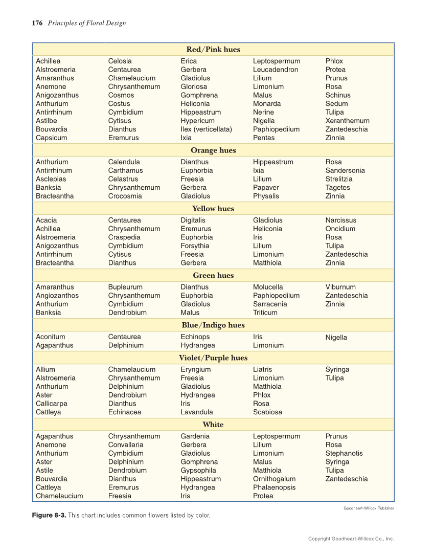 176 Principles of Floral Design Red/Pink hues Achillea Alstroemeria Amaranthus Anemone Anigozanthus Anthurium Antirrhinum Astilbe Bouvardia Capsicum Celosia Centaurea Chamelaucium Chrysanthemum Cosmos Costus Cymbidium Cytisus Dianthus Eremurus Erica Gerbera Gladiolus Gloriosa Gomphrena Heliconia Hippeastrum Hypericum Ilex (verticellata) Ixia Leptospermum Leucadendron Lilium Limonium Malus Monarda Nerine Nigella Paphiopedilum Pentas Phlox Protea Prunus Rosa Schinus Sedum Tulipa Xeranthemum Zantedeschia Zinnia Orange hues Anthurium Antirrhinum Asclepias Banksia Bracteantha Calendula Carthamus Celastrus Chrysanthemum Crocosmia Dianthus Euphorbia Freesia Gerbera Gladiolus Hippeastrum Ixia Lilium Papaver Physalis Rosa Sandersonia Strelitzia Tagetes Zinnia Yellow hues Acacia Achillea Alstroemeria Anigozanthus Antirrhinum Bracteantha Centaurea Chrysanthemum Craspedia Cymbidium Cytisus Dianthus Digitalis Eremurus Euphorbia Forsythia Freesia Gerbera Gladiolus Heliconia Iris Lilium Limonium Matthiola Narcissus Oncidium Rosa Tulipa Zantedeschia Zinnia Green hues Amaranthus Angiozanthos Anthurium Banksia Bupleurum Chrysanthemum Cymbidium Dendrobium Dianthus Euphorbia Gladiolus Malus Molucella Paphiopedilum Sarracenia Triticum Viburnum Zantedeschia Zinnia Blue/Indigo hues Aconitum Agapanthus Centaurea Delphinium Echinops Hydrangea Iris Limonium Nigella Violet/Purple hues Allium Alstroemeria Anthurium Aster Callicarpa Cattleya Chamelaucium Chrysanthemum Delphinium Dendrobium Dianthus Echinacea Eryngium Freesia Gladiolus Hydrangea Iris Lavandula Liatris Limonium Matthiola Phlox Rosa Scabiosa Syringa Tulipa White Agapanthus Anemone Anthurium Aster Astile Bouvardia Cattleya Chamelaucium Chrysanthemum Convallaria Cymbidium Delphinium Dendrobium Dianthus Eremurus Freesia Gardenia Gerbera Gladiolus Gomphrena Gypsophila Hippeastrum Hydrangea Iris Leptospermum Lilium Limonium Malus Matthiola Ornithogalum Phalaenopsis Protea Prunus Rosa Stephanotis Syringa Tulipa Zantedeschia Goodheart-Willcox Publisher Figure 8-3. This chart includes common fl owers listed by color. Copyright Goodheart-Willcox Co., Inc.