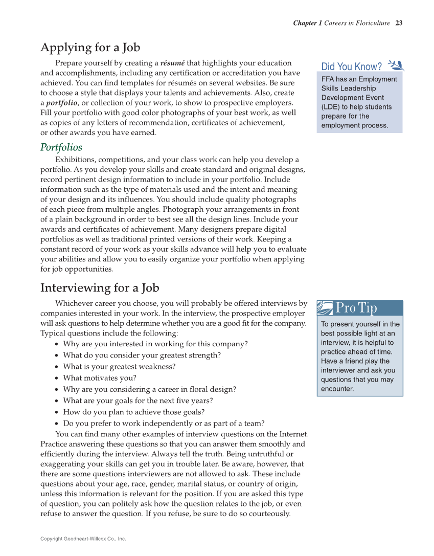 Chapter 1 Careers in Floriculture 23 Applying for a Job Prepare yourself by creating a résumé that highlights your education and accomplishments, including any certifi cation or accreditation you have achieved. You can fi nd templates for résumés on several websites. Be sure to choose a style that displays your talents and achievements. Also, create a portfolio, or collection of your work, to show to prospective employers. Fill your portfolio with good color photographs of your best work, as well as copies of any letters of recommendation, certifi cates of achievement, or other awards you have earned. Portfolios Exhibitions, competitions, and your class work can help you develop a portfolio. As you develop your skills and create standard and original designs, record pertinent design information to include in your portfolio. Include information such as the type of materials used and the intent and meaning of your design and its infl uences. You should include quality photographs of each piece from multiple angles. Photograph your arrangements in front of a plain background in order to best see all the design lines. Include your awards and certifi cates of achievement. Many designers prepare digital portfolios as well as traditional printed versions of their work. Keeping a constant record of your work as your skills advance will help you to evaluate your abilities and allow you to easily organize your portfolio when applying for job opportunities. Interviewing for a Job Whichever career you choose, you will probably be offered interviews by companies interested in your work. In the interview, the prospective employer will ask questions to help determine whether you are a good fi t for the company. Typical questions include the following: • Why are you interested in working for this company? • What do you consider your greatest strength? • What is your greatest weakness? • What motivates you? • Why are you considering a career in fl oral design? • What are your goals for the next fi ve years? • How do you plan to achieve those goals? • Do you prefer to work independently or as part of a team? You can fi nd many other examples of interview questions on the Internet. Practice answering these questions so that you can answer them smoothly and effi ciently during the interview. Always tell the truth. Being untruthful or exaggerating your skills can get you in trouble later. Be aware, however, that there are some questions interviewers are not allowed to ask. These include questions about your age, race, gender, marital status, or country of origin, unless this information is relevant for the position. If you are asked this type of question, you can politely ask how the question relates to the job, or even refuse to answer the question. If you refuse, be sure to do so courteously. Did You Know? FFA has an Employment Skills Leadership Development Event (LDE) to help students prepare for the employment process. Pro Tip To present yourself in the best possible light at an interview, it is helpful to practice ahead of time. Have a friend play the interviewer and ask you questions that you may encounter. Copyright Goodheart-Willcox Co., Inc.