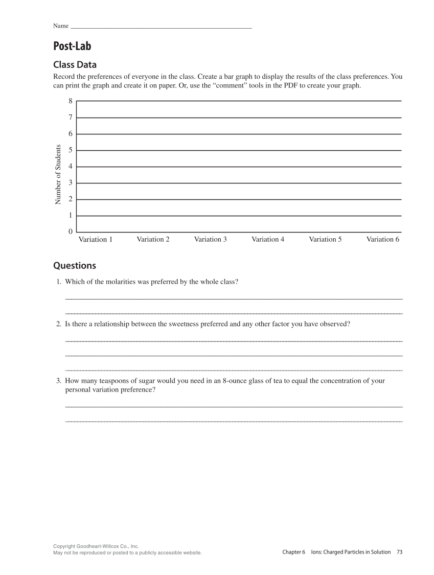 Chapter 6 Ions: Charged Particles in Solution 73 Copyright Goodheart-Willcox Co., Inc. May not be reproduced or posted to a publicly accessible website. Name ________________________________________________________________ Post-Lab Class Data Record the preferences of everyone in the class. Create a bar graph to display the results of the class preferences. You can print the graph and create it on paper. Or, use the “comment” tools in the PDF to create your graph. 8 7 6 5 4 3 2 1 0 Variation 1 Variation 6 Variation 2 Variation 3 Variation 4 Variation 5 Questions 1. Which of the molarities was preferred by the whole class? _ __________________________________________________________________________________________________________________ _________________________________________________________________________________________________________________ 2. Is there a relationship between the sweetness preferred and any other factor you have observed? _ __________________________________________________________________________________________________________________ __________________________________________________________________________________________________________________ _________________________________________________________________________________________________________________ 3. How many teaspoons of sugar would you need in an 8-ounce glass of tea to equal the concentration of your variation preference? _personal __________________________________________________________________________________________________________________ _________________________________________________________________________________________________________________ Number of Students