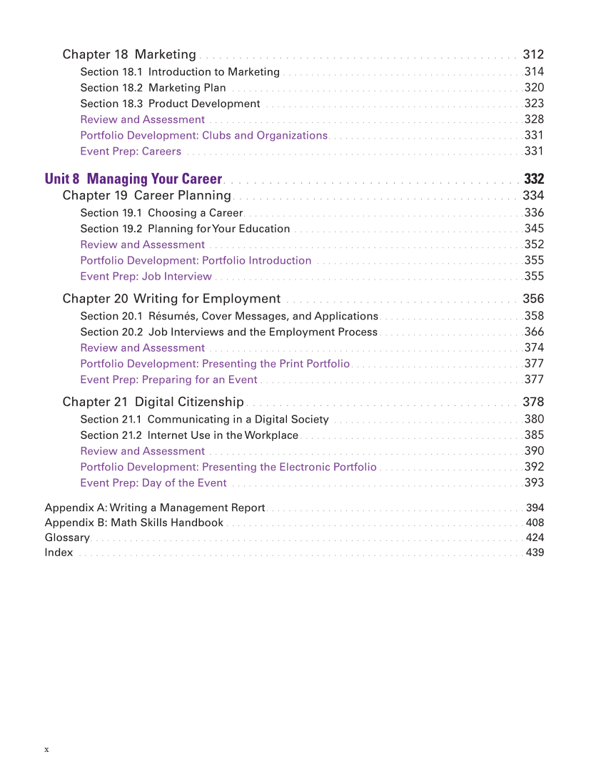 Chapter 18 Marketing . . . . . . . . . . . . . . . . . . . . . . . . . . . . . . . . . . . . . . . . . . . . . . . . 312 Section 18.1 Introduction to Marketing . . . . . . . . . . . . . . . . . . . . . . . . . . . . . . . . . . . . . . . . . . .314 Section 18.2 Marketing Plan . . . . . . . . . . . . . . . . . . . . . . . . . . . . . . . . . . . . . . . . . . . . . . . . . . . .320 Section 18.3 Product Development . . . . . . . . . . . . . . . . . . . . . . . . . . . . . . . . . . . . . . . . . . . . . .323 Review and Assessment . . . . . . . . . . . . . . . . . . . . . . . . . . . . . . . . . . . . . . . . . . . . . . . . . . . . . . . .328 Portfolio Development: Clubs and Organizations . . . . . . . . . . . . . . . . . . . . . . . . . . . . . . . . . . .331 Event Prep: Careers . . . . . . . . . . . . . . . . . . . . . . . . . . . . . . . . . . . . . . . . . . . . . . . . . . . . . . . . . . . .331 Unit 8 Managing Your Career. . . . . . . . . . . . . . . . . . . . . . . . . . . . . . . . . . . . . . . 332 Chapter 19 Career Planning . . . . . . . . . . . . . . . . . . . . . . . . . . . . . . . . . . . . . . . . . . . 334 Section 19.1 Choosing a Career . . . . . . . . . . . . . . . . . . . . . . . . . . . . . . . . . . . . . . . . . . . . . . . . . .336 Section 19.2 Planning for Your Education . . . . . . . . . . . . . . . . . . . . . . . . . . . . . . . . . . . . . . . . .345 Review and Assessment . . . . . . . . . . . . . . . . . . . . . . . . . . . . . . . . . . . . . . . . . . . . . . . . . . . . . . . .352 Portfolio Development: Portfolio Introduction . . . . . . . . . . . . . . . . . . . . . . . . . . . . . . . . . . . . .355 Event Prep: Job Interview . . . . . . . . . . . . . . . . . . . . . . . . . . . . . . . . . . . . . . . . . . . . . . . . . . . . . . .355 Chapter 20 Writing for Employment . . . . . . . . . . . . . . . . . . . . . . . . . . . . . . . . . . . 356 Section 20.1 Résumés, Cover Messages, and Applications . . . . . . . . . . . . . . . . . . . . . . . . . .358 Section 20.2 Job Interviews and the Employment Process . . . . . . . . . . . . . . . . . . . . . . . . . .366 Review and Assessment . . . . . . . . . . . . . . . . . . . . . . . . . . . . . . . . . . . . . . . . . . . . . . . . . . . . . . . .374 Portfolio Development: Presenting the Print Portfolio . . . . . . . . . . . . . . . . . . . . . . . . . . . . . . .377 Event Prep: Preparing for an Event . . . . . . . . . . . . . . . . . . . . . . . . . . . . . . . . . . . . . . . . . . . . . . .377 Chapter 21 Digital Citizenship . . . . . . . . . . . . . . . . . . . . . . . . . . . . . . . . . . . . . . . . . 378 Section 21.1 Communicating in a Digital Society . . . . . . . . . . . . . . . . . . . . . . . . . . . . . . . . . .380 Section 21.2 Internet Use in the Workplace . . . . . . . . . . . . . . . . . . . . . . . . . . . . . . . . . . . . . . . .385 Review and Assessment . . . . . . . . . . . . . . . . . . . . . . . . . . . . . . . . . . . . . . . . . . . . . . . . . . . . . . . .390 Portfolio Development: Presenting the Electronic Portfolio . . . . . . . . . . . . . . . . . . . . . . . . . .392 Event Prep: Day of the Event . . . . . . . . . . . . . . . . . . . . . . . . . . . . . . . . . . . . . . . . . . . . . . . . . . . .393 Appendix A: Writing a Management Report . . . . . . . . . . . . . . . . . . . . . . . . . . . . . . . . . . . . . . . . . . . . . . 394 Appendix B: Math Skills Handbook . . . . . . . . . . . . . . . . . . . . . . . . . . . . . . . . . . . . . . . . . . . . . . . . . . . . . 408 Glossary. . . . . . . . . . . . . . . . . . . . . . . . . . . . . . . . . . . . . . . . . . . . . . . . . . . . . . . . . . . . . . . . . . . . . . . . . . . . . 424 Index . . . . . . . . . . . . . . . . . . . . . . . . . . . . . . . . . . . . . . . . . . . . . . . . . . . . . . . . . . . . . . . . . . . . . . . . . . . . . . . 439 x