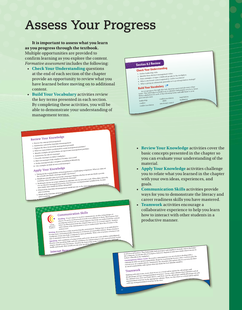 Assess Your Progress It is important to assess what you learn as you progress through the textbook. Multiple opportunities are provided to confirm learning as you explore the content. Formative assessment includes the following: • Check Your Understanding questions at the end of each section of the chapter provide an opportunity to review what you have learned before moving on to additional content. • Build Your Vocabulary activities review the key terms presented in each section. By completing these activities, you will be able to demonstrate your understanding of management terms. • Review Your Knowledge activities cover the basic concepts presented in the chapter so you can evaluate your understanding of the material. • Apply Your Knowledge activities challenge you to relate what you learned in the chapter with your own ideas, experiences, and goals. • Communication Skills activities provide ways for you to demonstrate the literacy and career readiness skills you have mastered. • Teamwork activities encourage a collaborative experience to help you learn how to interact with other students in a productive manner. Figure 8-5 A conflict res resolve issues efficiently. a lose. The result can be rejection opportunity. Section 8.2 Review Check Your Understanding 1. Define leadership style. 2. Identify three distinct management styles. 3. State examples of types of difficult people in the workplace. 4. Why is emotional control required in conflict resolution? 5. Why is giving an ultimatum generally not a good negotiation strategy? Build Your Vocabulary As you progress through this text, develop a personal glossary of key terms. This will help you build your vocabulary and prepare you for a career. Write a definition for each of the following terms and add them to your personal glossary. leadership conflict conflict resolution conflict-resolution skills emotional control negotiation mediation ultimatum Copyright Goodheart-Willcox Co., Inc. Review Your Knowledge 1. Discuss the concept of management. 2. Summarize each of the functions of management. 3. Explain the three levels of the management pyramid. 4. What are typical duties performed by senior management positions? 5. Identify examples of typical duties of supervisory management positions. 6. Summarize the role of a manager. 7. Describe managers in today’s workplace. 8. How can managers help employees become successful? 9. Define managerial roles categories according to Mintzberg. 10. Cite examples of skills of successful managers. Apply Your Knowledge 1. Taking on the responsibilities of management is a challenging assignment. What are some of the rewards you think a manager might experience? 2. Would you consider your instructor a manager? Explain whether or not you think a person teaching a class could also be considered a manager. 3. To delegate means to assign authority to someone else to carry out a task. When done correctly, it is an effective management practice that increases an organization’s productivity. In your own words, how would you define delegation? 4. Which of the functions of management would you rate as the most important function? Explain your reasoning. 5. Which of the functions of management would you rate as the least important function? Explain your reasoning. 6. In your own words, describe an ideal manager candidate for today’s workplace. h part time jobs while earning an education. Other students may volunteer l t er work can offer career experience that j b r at a 6 I n 6 I n Communication Skills Reading. Visual support is used to communicate an idea using images or objects. It can be used instead of words or in addition to them. Illustrations that accompany written text are visual supports that help you understand the content. Select an illustration from this chapter that serves as a visual support. Analyze and evaluate if the information is easy to understand. How does it relate to the written text? Writing. Everyone has a stake in protecting the environment. Taking steps as an individual to become more environmentally conscious is a behavior of responsible citizens. From a business standpoint, it may also help a company be more profitable. Write a list of actions a business can take to minimize risk to the environment. Speaking. Self-confidence is being certain and secure about one’s own abilities and judgment. Practice your speaking skills and self-confidence by volunteering to read a special feature in this chapter aloud to your classmates. Stand in the front of the room, control your voice, and read loudly and clearly. How would you rate your speaking skills? Internet Research Elements of a Contract. A partnership agreement is a contract used when two or more C duct a search for a partnership agreement sample . Review the k t efine it or improve? College and Career Readiness assignment, will need to complete the project as well as would use to track your progress. Explain how you will use the tool to keep y p Ethical Workplace Behavior. Business ethics are rules for professional conduct and integrity in all areas of business. They help guide both managers and employees to make correct decisions for a company. Search for ethical workplace behavior . Explain in your own words what it means to behave ethically in the workplace. Contemporary Ethics Cases. Research a contemporary case of a business dealing with a violation of ethics or social responsibility. Begin by searching for business ethics violation plus the current year, or a similar phrase. Summarize the situation and explain why it is an issue of ethics or social responsibility and explain what you think the best solution would be. Teamworkteam, Working with your create chart to use as a visual aid to explain the advantages and disadvantages of types of organizational structures. Create a four-column chart and label each of the columns Line, Line-and-Staff, Matrix, and Team . List the advantages and disadvantages of each organiza