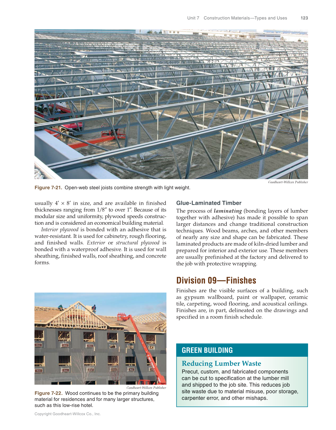 Copyright Goodheart-Willcox Co., Inc. Unit 7 Construction Materials—Types and Uses 123 Glue-Laminated Timber The process of laminating (bonding layers of lumber g together with adhesive) has made it possible to span larger distances and change traditional construction techniques. Wood beams, arches, and other members of nearly any size and shape can be fabricated. These laminated products are made of kiln-dried lumber and prepared for interior and exterior use. These members are usually prefinished at the factory and delivered to the job with protective wrapping. Division 09—Finishes Finishes are the visible surfaces of a building, such as gypsum wallboard, paint or wallpaper, ceramic tile, carpeting, wood flooring, and acoustical ceilings. Finishes are, in part, delineated on the drawings and specified in a room finish schedule. usually 4′ × 8′ in size, and are available in finished thicknesses ranging from 1/8″ to over 1″. ″ Because of its ″ modular size and uniformity, plywood speeds construc- tion and is considered an economical building material. Interior plywood is bonded with an adhesive that is water-resistant. It is used for cabinetry, rough flooring, and finished walls. Exterior or structural plywood is bonded with a waterproof adhesive. It is used for wall sheathing, finished walls, roof sheathing, and concrete forms. Goodheart-Willcox Publisher Figure 7-21. Open-web steel joists combine strength with light weight. Goodheart-Willcox Publisher Figure 7-22. Wood continues to be the primary building material for residences and for many larger structures, such as this low-rise hotel. Reducing Lumber Waste Pre ec ut, custo t om , and fabricated components can n be e cut to t o specification at the lumber be milll and d shipped h d to the job site. This reduc u ce s job b site e wa as te du d ue to material misuse, poor oo stora ag e e, car rp enter n err ro r, and other mishaps. GREEN BUILDING