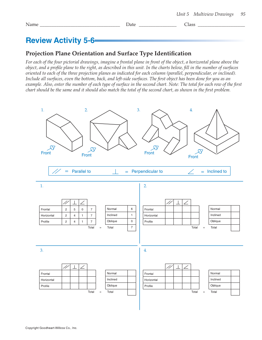 Unit 5 Multiview Drawings 95 Copyright Goodheart-Willcox Co., Inc. Name __________________________________ Date ________________ Class ____________________ Review Activity 5-6 Projection Plane Orientation and Surface Type Identification For each of the four pictorial drawings, imagine a frontal plane in front of the object, a horizontal plane above the object, and a profile plane to the right, as described in this unit. In the charts below, fill in the number of surfaces oriented to each of the three projection planes as indicated for each column (parallel, perpendicular, or inclined). Include all surfaces, even the bottom, back, and left-side surfaces. The first object has been done for you as an example. Also, enter the number of each type of surface in the second chart. Note: The total for each row of the first chart should be the same and it should also match the total of the second chart, as shown in the first problem. Front Front Front Front Parallel to Perpendicular to Inclined to Frontal 2 5 0 7 Horizontal 2 4 1 7 Profile 2 4 1 7 Normal 6 Inclined 1 Oblique 0 7 Total = Total Frontal Horizontal Profile Normal Inclined Oblique 1. 3. 2. 4. 1. 2. 3. 4. Total = Total Frontal Horizontal Profile Normal Inclined Oblique Total = Total Frontal Horizontal Profile Normal Inclined Oblique Total = Total