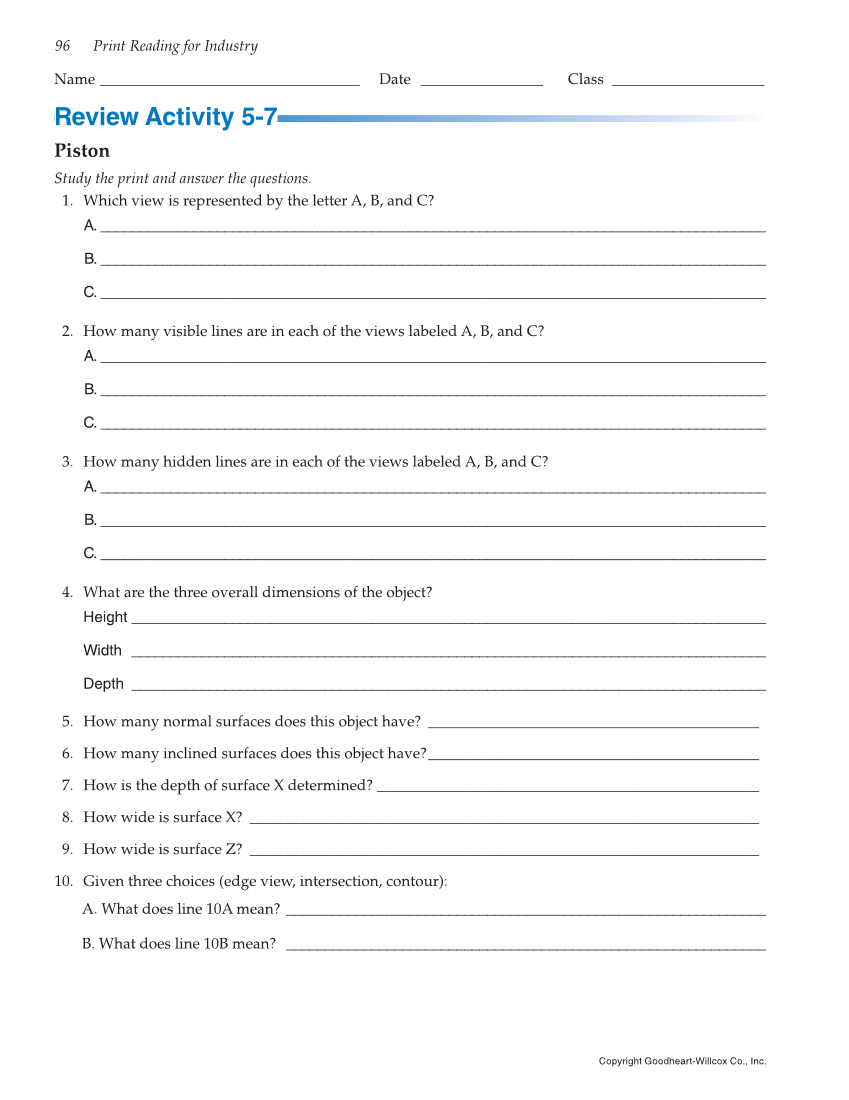 96 Print Reading for Industry Copyright Goodheart-Willcox Co., Inc. Name __________________________________ Date ________________ Class ____________________ Review Activity 5-7 Piston Study the print and answer the questions. 1. Which view is represented by the letter A, B, and C? A. ______________________________________________________________________________________ B. ______________________________________________________________________________________ C. ______________________________________________________________________________________ 2. How many visible lines are in each of the views labeled A, B, and C? A. ______________________________________________________________________________________ B. ______________________________________________________________________________________ C. ______________________________________________________________________________________ 3. How many hidden lines are in each of the views labeled A, B, and C? A. ______________________________________________________________________________________ B. ______________________________________________________________________________________ C. ______________________________________________________________________________________ 4. What are the three overall dimensions of the object? Height __________________________________________________________________________________ Width __________________________________________________________________________________ Depth __________________________________________________________________________________ 5. How many normal surfaces does this object have? _______________________________________ 6. How many inclined surfaces does this object have? _______________________________________ 7. How is the depth of surface X determined? _____________________________________________ 8. How wide is surface X? ____________________________________________________________ 9. How wide is surface Z? ____________________________________________________________ 10. Given three choices (edge view, intersection, contour): A. What does line 10A mean? ______________________________________________________________ B. What does line 10B mean? ______________________________________________________________
