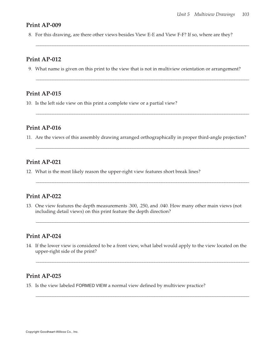 Unit 5 Multiview Drawings 103 Copyright Goodheart-Willcox Co., Inc. Print AP-009 8. For this drawing, are there other views besides View E-E and View F-F? If so, where are they? ________________________________________________________________________________________ Print AP-012 9. What name is given on this print to the view that is not in multiview orientation or arrangement? ________________________________________________________________________________________ Print AP-015 10. Is the left side view on this print a complete view or a partial view? ________________________________________________________________________________________ Print AP-016 11. Are the views of this assembly drawing arranged orthographically in proper third-angle projection? ________________________________________________________________________________________ Print AP-021 12. What is the most likely reason the upper-right view features short break lines? ________________________________________________________________________________________ Print AP-022 13. One view features the depth measurements .300, .250, and .040. How many other main views (not including detail views) on this print feature the depth direction? ________________________________________________________________________________________ Print AP-024 14. If the lower view is considered to be a front view, what label would apply to the view located on the upper-right side of the print? ________________________________________________________________________________________ Print AP-025 15. Is the view labeled FORMED VIEW a normal view defined by multiview practice? ________________________________________________________________________________________