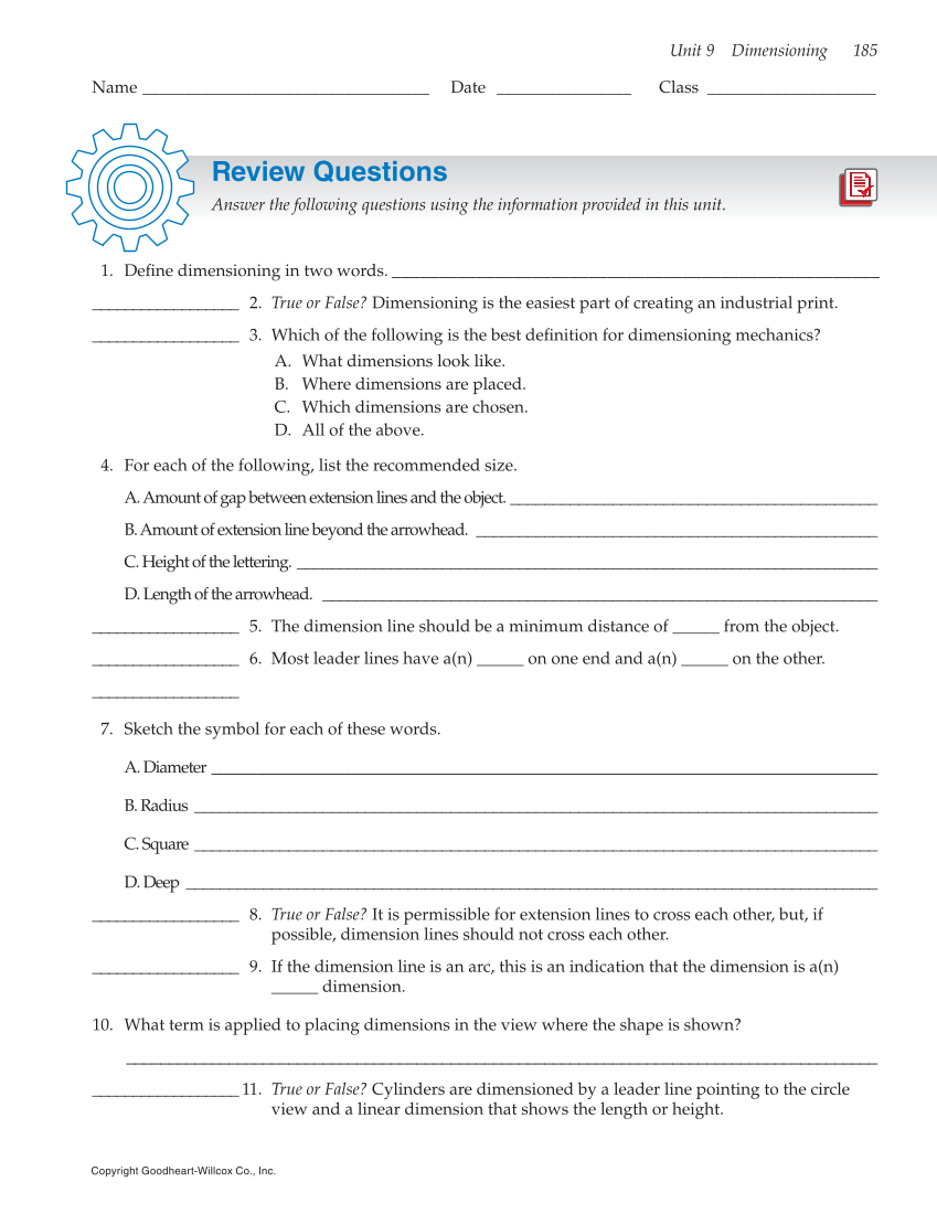 Unit 9 Dimensioning 185 Copyright Goodheart-Willcox Co., Inc. Name __________________________________ Date ________________ Class ____________________ Review Questions Answer the following questions using the information provided in this unit. 1. Define dimensioning in two words. ____________________________________________________ __________________ 2. True or False? Dimensioning is the easiest part of creating an industrial print. __________________ 3. Which of the following is the best definition for dimensioning mechanics? A. What dimensions look like. B. Where dimensions are placed. C. Which dimensions are chosen. D. All of the above. 4. For each of the following, list the recommended size. A. Amount of gap between extension lines and the object. ___________________________________________ B. Amount of extension line beyond the arrowhead. _______________________________________________ C. Height of the lettering. ____________________________________________________________________ D. Length of the arrowhead. _________________________________________________________________ __________________ 5. The dimension line should be a minimum distance of _____ from the object. __________________ 6. Most leader lines have a(n) _____ on one end and a(n) _____ on the other. __________________ 7. Sketch the symbol for each of these words. A. Diameter ______________________________________________________________________________ B. Radius ________________________________________________________________________________ C. Square ________________________________________________________________________________ D. Deep _________________________________________________________________________________ __________________ 8. True or False? It is permissible for extension lines to cross each other, but, if possible, dimension lines should not cross each other. __________________ 9. If the dimension line is an arc, this is an indication that the dimension is a(n) _____ dimension. 10. What term is applied to placing dimensions in the view where the shape is shown? ________________________________________________________________________________________ __________________ 11. True or False? Cylinders are dimensioned by a leader line pointing to the circle view and a linear dimension that shows the length or height.