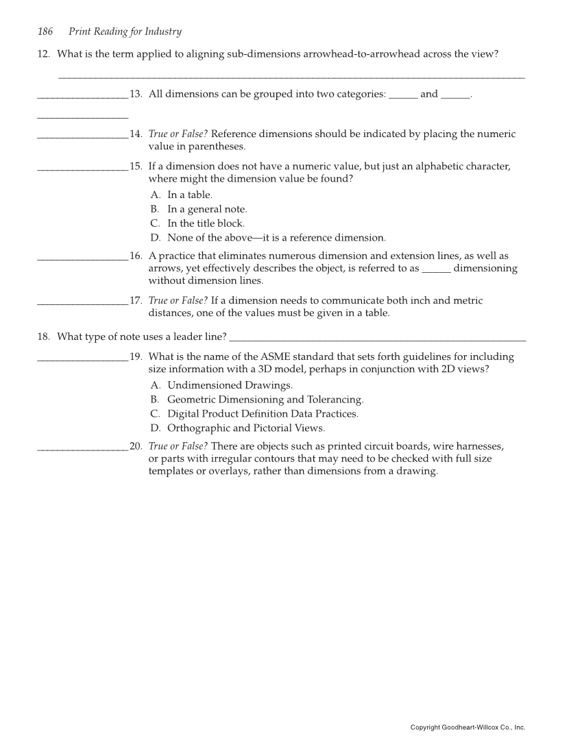 186 Print Reading for Industry Copyright Goodheart-Willcox Co., Inc. 12. What is the term applied to aligning sub-dimensions arrowhead-to-arrowhead across the view? ________________________________________________________________________________________ __________________ 13. All dimensions can be grouped into two categories: _____ and _____. __________________ __________________ 14. True or False? Reference dimensions should be indicated by placing the numeric value in parentheses. __________________ 15. If a dimension does not have a numeric value, but just an alphabetic character, where might the dimension value be found? A. In a table. B. In a general note. C. In the title block. D. None of the above—it is a reference dimension. __________________ 16. A practice that eliminates numerous dimension and extension lines, as well as arrows, yet effectively describes the object, is referred to as _____ dimensioning without dimension lines. __________________ 17. True or False? If a dimension needs to communicate both inch and metric distances, one of the values must be given in a table. 18. What type of note uses a leader line? ___________________________________________________ __________________ 19. What is the name of the ASME standard that sets forth guidelines for including size information with a 3D model, perhaps in conjunction with 2D views? A. Undimensioned Drawings. B. Geometric Dimensioning and Tolerancing. C. Digital Product Definition Data Practices. D. Orthographic and Pictorial Views. __________________ 20. True or False? There are objects such as printed circuit boards, wire harnesses, or parts with irregular contours that may need to be checked with full size templates or overlays, rather than dimensions from a drawing.