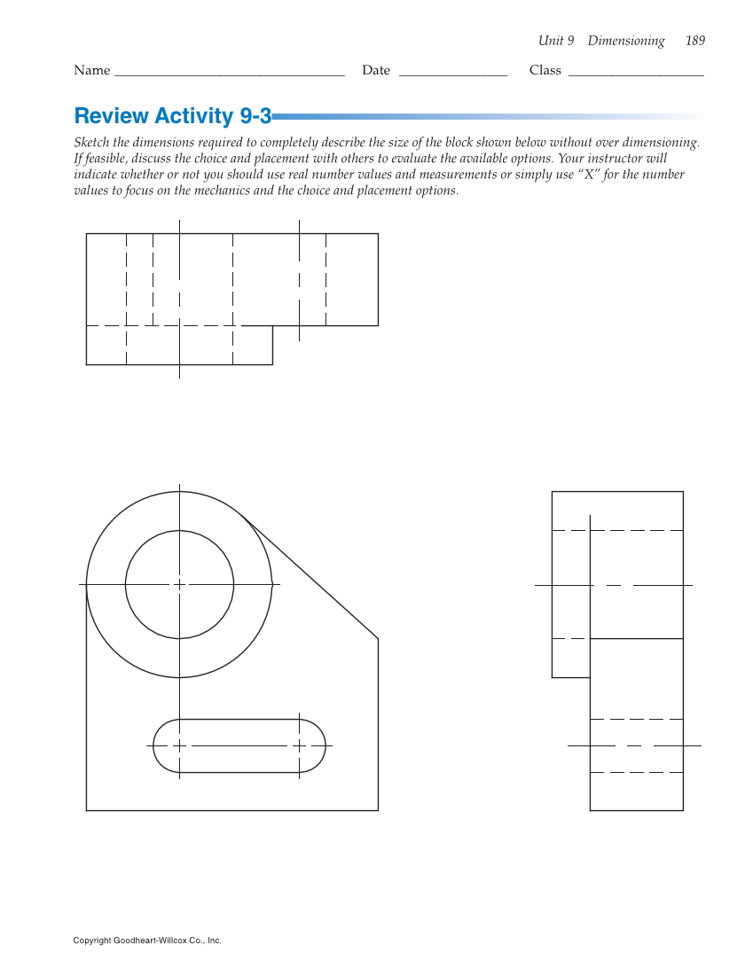 Unit 9 Dimensioning 189 Copyright Goodheart-Willcox Co., Inc. Name __________________________________ Date ________________ Class ____________________ Review Activity 9-3 Sketch the dimensions required to completely describe the size of the block shown below without over dimensioning. If feasible, discuss the choice and placement with others to evaluate the available options. Your instructor will indicate whether or not you should use real number values and measurements or simply use “X” for the number values to focus on the mechanics and the choice and placement options.