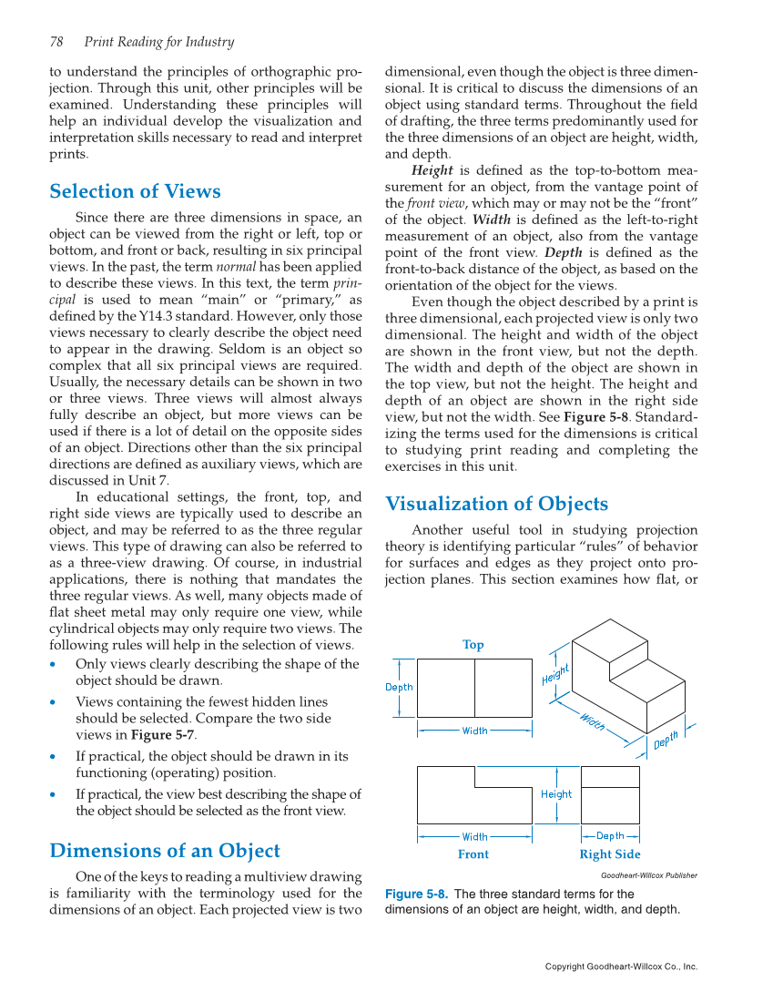 78 Print Reading for Industry Copyright Goodheart-Willcox Co., Inc. to understand the principles of orthographic pro- jection. Through this unit, other principles will be examined. Understanding these principles will help an individual develop the visualization and interpretation skills necessary to read and interpret prints. Selection of Views Since there are three dimensions in space, an object can be viewed from the right or left, top or bottom, and front or back, resulting in six principal views. In the past, the term normal has been applied to describe these views. In this text, the term prin- cipal is used to mean “main” or “primary,” as defined by the Y14.3 standard. However, only those views necessary to clearly describe the object need to appear in the drawing. Seldom is an object so complex that all six principal views are required. Usually, the necessary details can be shown in two or three views. Three views will almost always fully describe an object, but more views can be used if there is a lot of detail on the opposite sides of an object. Directions other than the six principal directions are defined as auxiliary views, which are discussed in Unit 7. In educational settings, the front, top, and right side views are typically used to describe an object, and may be referred to as the three regular views. This type of drawing can also be referred to as a three-view drawing. Of course, in industrial applications, there is nothing that mandates the three regular views. As well, many objects made of flat sheet metal may only require one view, while cylindrical objects may only require two views. The following rules will help in the selection of views. • Only views clearly describing the shape of the object should be drawn. • Views containing the fewest hidden lines should be selected. Compare the two side views in Figure 5-7. • If practical, the object should be drawn in its functioning (operating) position. • If practical, the view best describing the shape of the object should be selected as the front view. Dimensions of an Object One of the keys to reading a multiview drawing is familiarity with the terminology used for the dimensions of an object. Each projected view is two dimensional, even though the object is three dimen- sional. It is critical to discuss the dimensions of an object using standard terms. Throughout the field of drafting, the three terms predominantly used for the three dimensions of an object are height, width, and depth. Height is defined as the top-to-bottom mea- surement for an object, from the vantage point of the front view, which may or may not be the “front” of the object. Width is defined as the left-to-right measurement of an object, also from the vantage point of the front view. Depth is defined as the front-to-back distance of the object, as based on the orientation of the object for the views. Even though the object described by a print is three dimensional, each projected view is only two dimensional. The height and width of the object are shown in the front view, but not the depth. The width and depth of the object are shown in the top view, but not the height. The height and depth of an object are shown in the right side view, but not the width. See Figure 5-8. Standard- izing the terms used for the dimensions is critical to studying print reading and completing the exercises in this unit. Visualization of Objects Another useful tool in studying projection theory is identifying particular “rules” of behavior for surfaces and edges as they project onto pro- jection planes. This section examines how flat, or Goodheart-Willcox Publisher Figure 5-8. The three standard terms for the dimensions of an object are height, width, and depth. Top Front Right Side