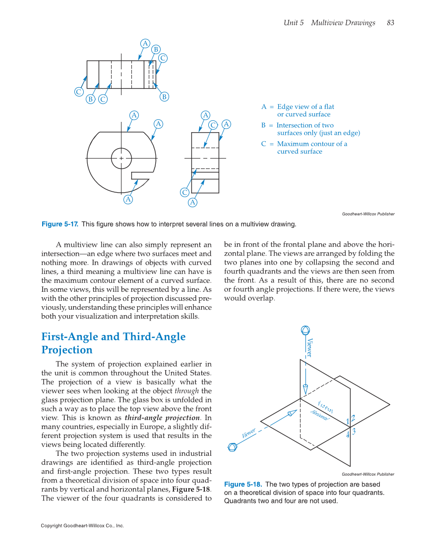 Unit 5 Multiview Drawings 83 Copyright Goodheart-Willcox Co., Inc. A multiview line can also simply represent an intersection—an edge where two surfaces meet and nothing more. In drawings of objects with curved lines, a third meaning a multiview line can have is the maximum contour element of a curved surface. In some views, this will be represented by a line. As with the other principles of projection discussed pre- viously, understanding these principles will enhance both your visualization and interpretation skills. First-Angle and Third-Angle Projection The system of projection explained earlier in the unit is common throughout the United States. The projection of a view is basically what the viewer sees when looking at the object through the glass projection plane. The glass box is unfolded in such a way as to place the top view above the front view. This is known as third-angle projection. In many countries, especially in Europe, a slightly dif- ferent projection system is used that results in the views being located differently. The two projection systems used in industrial drawings are identified as third-angle projection and first-angle projection. These two types result from a theoretical division of space into four quad- rants by vertical and horizontal planes, Figure 5-18. The viewer of the four quadrants is considered to be in front of the frontal plane and above the hori- zontal plane. The views are arranged by folding the two planes into one by collapsing the second and fourth quadrants and the views are then seen from the front. As a result of this, there are no second or fourth angle projections. If there were, the views would overlap. Goodheart-Willcox Publisher Figure 5-17. This figure shows how to interpret several lines on a multiview drawing. A = Edge view of a flat or curved surface B = Intersection of two surfaces only (just an edge) C = Maximum contour of a curved surface B C C A A B A A C A C A C A B Goodheart-Willcox Publisher Figure 5-18. The two types of projection are based on a theoretical division of space into four quadrants. Quadrants two and four are not used. V i ewe r Viewer Hori zonta l Frontal 1 2 4 3