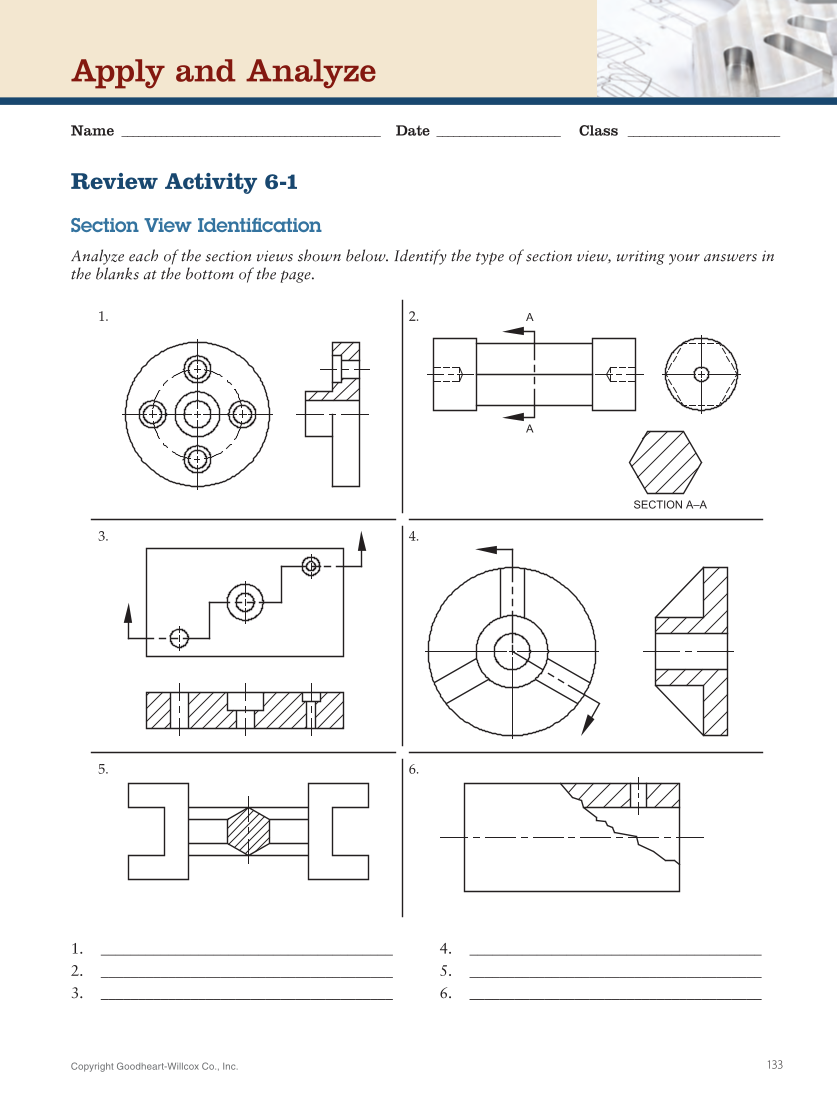 Copyright Goodheart-Willcox Co., Inc. 133 Review Activity 6-1 Section View Identification Analyze each of the section views shown below. Identify the type of section view, writing your answers in the blanks at the bottom of the page. 4. ________________________________________ 5. ________________________________________ 6. ________________________________________ Apply and Analyze Name _ ______________________________________________ Date _______________________ Class _ ___________________________ SECTION A–A A A 1. 2. 3. 4. 5. 6. 1. ________________________________________ 2. ________________________________________ 3. ________________________________________