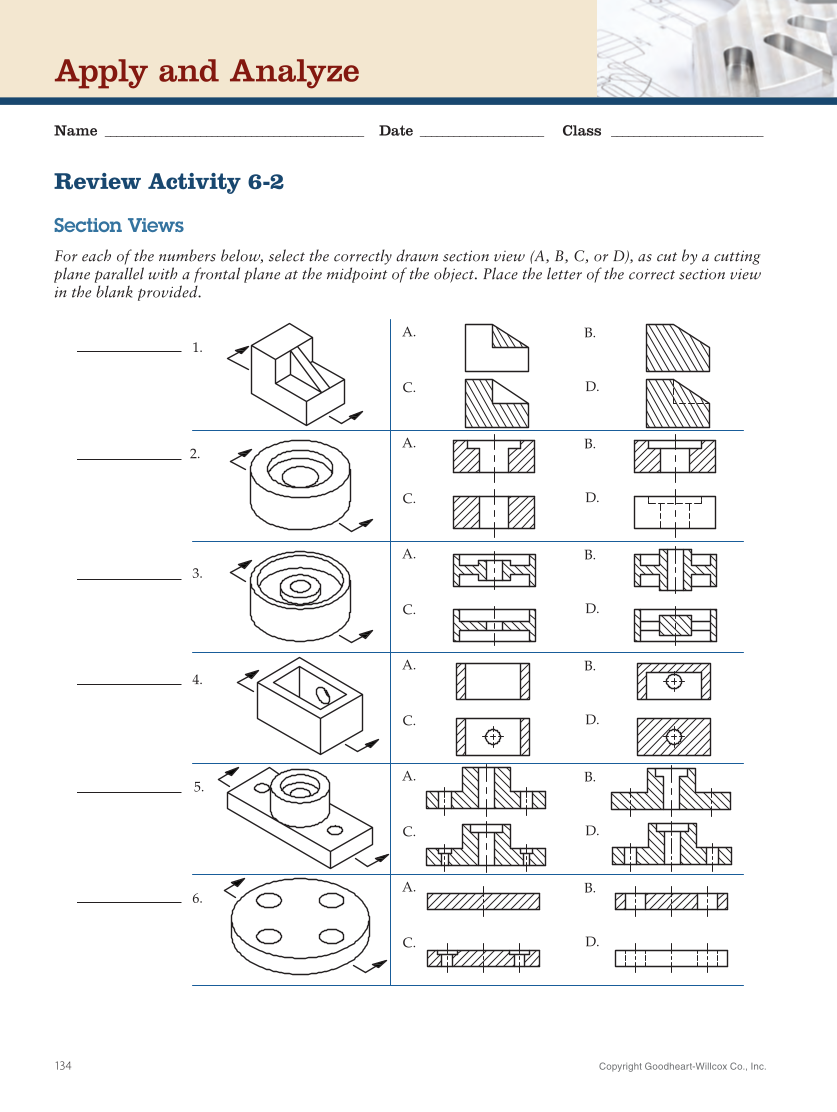 Copyright Goodheart-Willcox Co., Inc. 134 Review Activity 6-2 Section Views For each of the numbers below, select the correctly drawn section view (A, B, C, or D), as cut by a cutting plane parallel with a frontal plane at the midpoint of the object. Place the letter of the correct section view in the blank provided. Apply and Analyze Name _ ______________________________________________ Date _______________________ Class _ ___________________________ 6. 5. 4. 3. 1. 2. A. B. C. D. C. A. B. D. C. A. B. D. C. A. B. D. C. A. B. D. C. A. B. D.