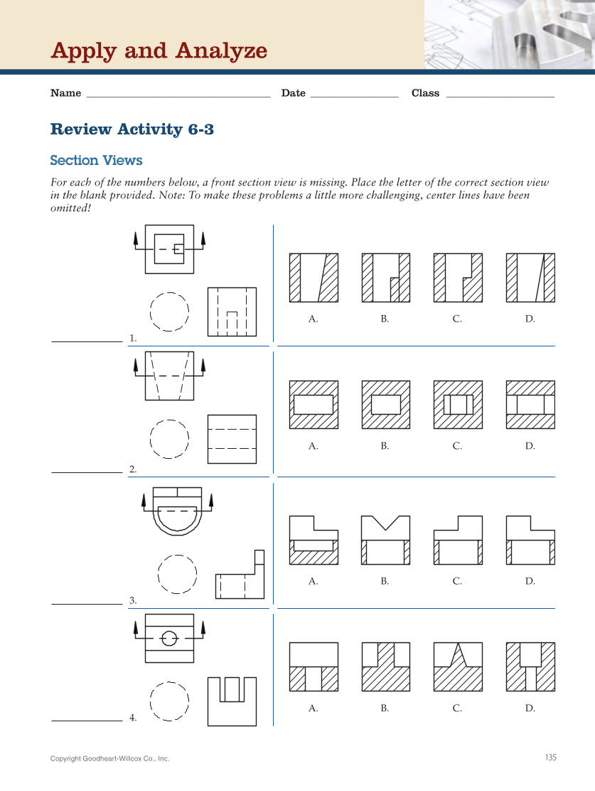 Copyright Goodheart-Willcox Co., Inc. 135 Review Activity 6-3 Section Views For each of the numbers below, a front section view is missing. Place the letter of the correct section view in the blank provided. Note: To make these problems a little more challenging, center lines have been omitted! Apply and Analyze Name _ ______________________________________________ Date _______________________ Class _ ___________________________ A. B. C. D. A. B. C. D. A. B. C. D. 1. 2. 3. A. B. C. D. 4.