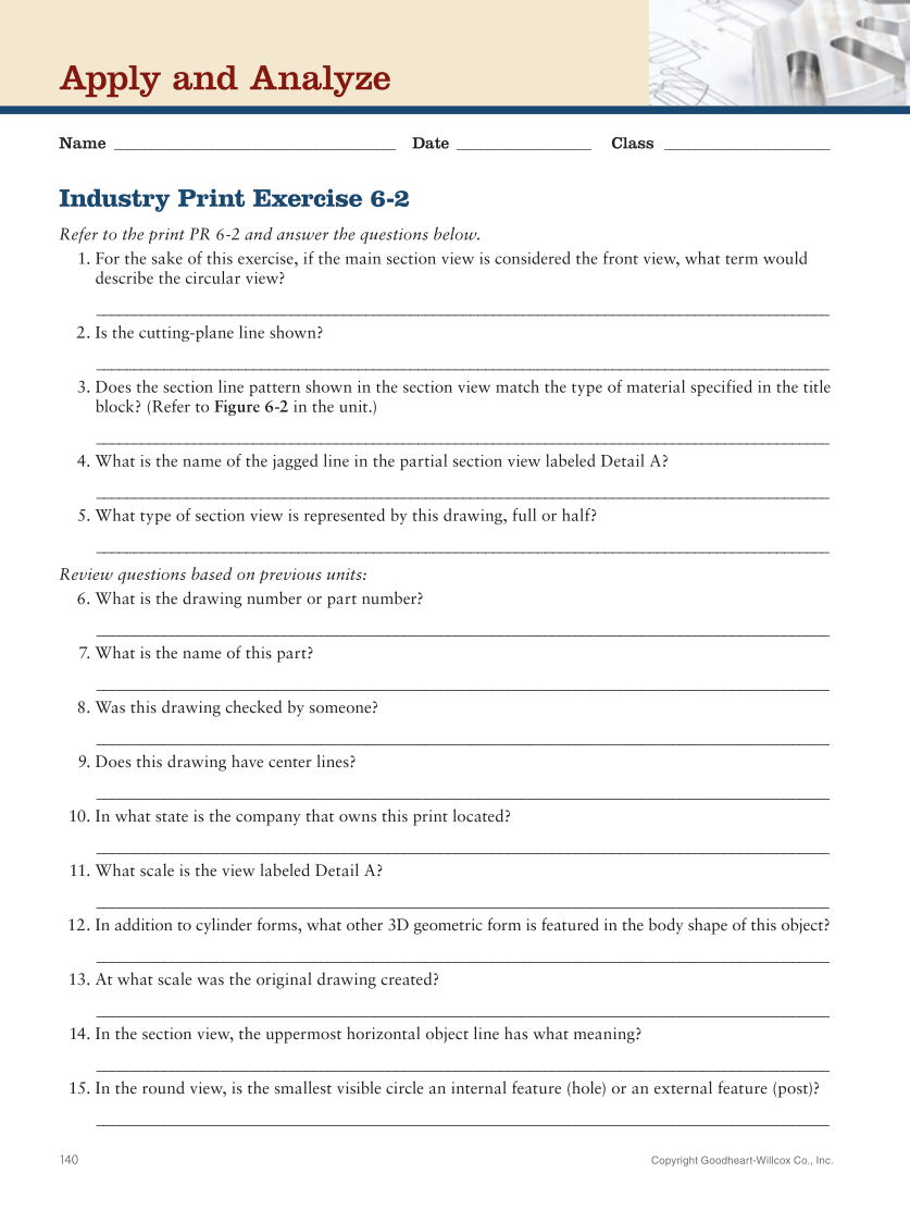 Copyright Goodheart-Willcox Co., Inc. 140 Apply and Analyze Name _ ______________________________________________ Date _______________________ Class _ ___________________________ Industry Print Exercise 6-2 Refer to the print PR 6-2 and answer the questions below. 1. For the sake of this exercise, if the main section view is considered the front view, what term would describe the circular view? _ __________________________________________________________________________________________________ 2. the cutting-plane line shown? _Is __________________________________________________________________________________________________ 3. Does the section line pattern shown in the section view match the type of material specified in the title block? (Refer to Figure 6-2 in the unit.) _ __________________________________________________________________________________________________ 4. is the name of the jagged line in the partial section view labeled Detail A? _What __________________________________________________________________________________________________ 5. type of section view is represented by this drawing, full or half? _What __________________________________________________________________________________________________ Review questions based on previous units: 6. What is the drawing number or part number? _ __________________________________________________________________________________________________ 7. What is the name of this part? _ __________________________________________________________________________________________________ 8. this drawing checked by someone? _Was __________________________________________________________________________________________________ 9. this drawing have center lines? _Does __________________________________________________________________________________________________ 10. what state is the company that owns this print located? _In __________________________________________________________________________________________________ 11. scale is the view labeled Detail A? _What __________________________________________________________________________________________________ 12. In addition to cylinder forms, what other 3D geometric form is featured in the body shape of this object? _ __________________________________________________________________________________________________ 13. At what scale was the original drawing created? _ __________________________________________________________________________________________________ 14. the section view, the uppermost horizontal object line has what meaning? _In __________________________________________________________________________________________________ 15. the round view, is the smallest visible circle an internal feature (hole) or an external feature (post)? _In __________________________________________________________________________________________________