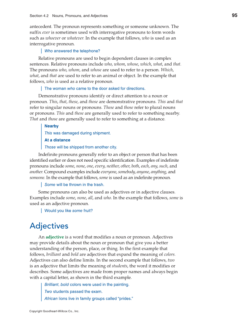95 Section 4.2 Nouns, Pronouns, and Adjectives Copyright Goodheart-Willcox Co., Inc. antecedent. The pronoun represents something or someone unknown. The suffix ever is sometimes used with interrogative pronouns to form words such as whoever or whatever. In the example that follows, who is used as an interrogative pronoun. Who answered the telephone? Relative pronouns are used to begin dependent clauses in complex sentences. Relative pronouns include who, whom, whose, which, what, and that. The pronouns who, whom, and whose are used to refer to a person. Which, what, and that are used to refer to an animal or object. In the example that follows, who is used as a relative pronoun. The woman who came to the door asked for directions. Demonstrative pronouns identify or direct attention to a noun or pronoun. This, that, these, and those are demonstrative pronouns. This and that refer to singular nouns or pronouns. These and those refer to plural nouns or pronouns. This and these are generally used to refer to something nearby. That and those are generally used to refer to something at a distance. Nearby This was damaged during shipment. At a distance Those will be shipped from another city. Indefinite pronouns generally refer to an object or person that has been identified earlier or does not need specific identification. Examples of indefinite pronouns include some, none, one, every, neither, other, both, each, any, such, and another. Compound examples include everyone, somebody, anyone, anything, and someone. In the example that follows, some is used as an indefinite pronoun. Some will be thrown in the trash. Some pronouns can also be used as adjectives or in adjective clauses. Examples include some, none, all, and who. In the example that follows, some is used as an adjective pronoun. Would you like some fruit? Adjectives An adjective is a word that modifies a noun or pronoun. Adjectives may provide details about the noun or pronoun that give you a better understanding of the person, place, or thing. In the first example that follows, brilliant and bold are adjectives that expand the meaning of colors. Adjectives can also define limits. In the second example that follows, two is an adjective that limits the meaning of students, the word it modifies or describes. Some adjectives are made from proper names and always begin with a capital letter, as shown in the third example. Brilliant, bold colors were used in the painting. Two students passed the exam. African lions live in family groups called “prides.”