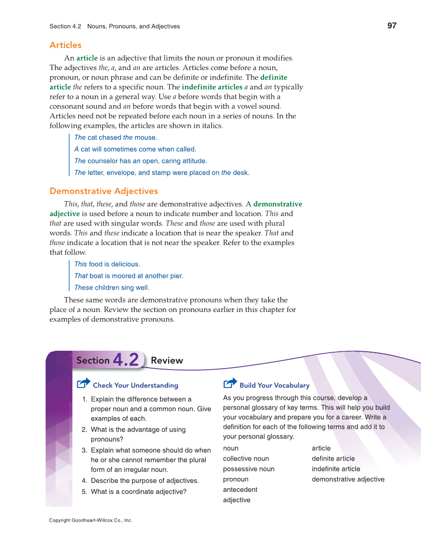 97 Section 4.2 Nouns, Pronouns, and Adjectives Copyright Goodheart-Willcox Co., Inc. Articles An article is an adjective that limits the noun or pronoun it modifies. The adjectives the, a, and an are articles. Articles come before a noun, pronoun, or noun phrase and can be definite or indefinite. The definite article the refers to a specific noun. The indefinite articles a and an typically refer to a noun in a general way. Use a before words that begin with a consonant sound and an before words that begin with a vowel sound. Articles need not be repeated before each noun in a series of nouns. In the following examples, the articles are shown in italics. The cat chased the mouse. A cat will sometimes come when called. The counselor has an open, caring attitude. The letter, envelope, and stamp were placed on the desk. Demonstrative Adjectives This, that, these, and those are demonstrative adjectives. A demonstrative adjective is used before a noun to indicate number and location. This and that are used with singular words. These and those are used with plural words. This and these indicate a location that is near the speaker. That and those indicate a location that is not near the speaker. Refer to the examples that follow. This food is delicious. That boat is moored at another pier. These children sing well. These same words are demonstrative pronouns when they take the place of a noun. Review the section on pronouns earlier in this chapter for examples of demonstrative pronouns. Check Your Understanding 1. Explain the difference between a proper noun and a common noun. Give examples of each. 2. What is the advantage of using pronouns? 3. Explain what someone should do when he or she cannot remember the plural form of an irregular noun. 4. Describe the purpose of adjectives. 5. What is a coordinate adjective? Build Your Vocabulary As you progress through this course, develop a personal glossary of key terms. This will help you build your vocabulary and prepare you for a career. Write a definition for each of the following terms and add it to your personal glossary. noun collective noun possessive noun pronoun antecedent adjective article definite article indefinite article demonstrative adjective Section 4.2 Review