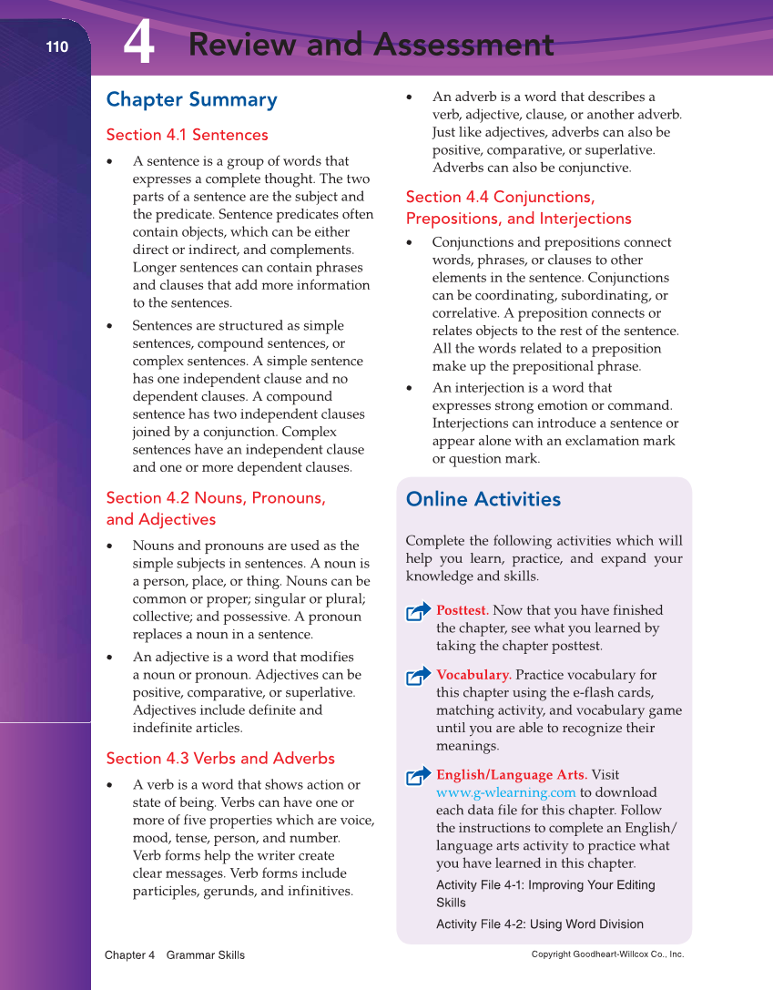 Copyright Goodheart-Willcox Co., Inc. Chapter 4 Grammar Skills 110 Review and Assessment 4 Chapter Summary Section 4.1 Sentences • A sentence is a group of words that expresses a complete thought. The two parts of a sentence are the subject and the predicate. Sentence predicates often contain objects, which can be either direct or indirect, and complements. Longer sentences can contain phrases and clauses that add more information to the sentences. • Sentences are structured as simple sentences, compound sentences, or complex sentences. A simple sentence has one independent clause and no dependent clauses. A compound sentence has two independent clauses joined by a conjunction. Complex sentences have an independent clause and one or more dependent clauses. Section 4.2 Nouns, Pronouns, and Adjectives • Nouns and pronouns are used as the simple subjects in sentences. A noun is a person, place, or thing. Nouns can be common or proper singular or plural collective and possessive. A pronoun replaces a noun in a sentence. • An adjective is a word that modifies a noun or pronoun. Adjectives can be positive, comparative, or superlative. Adjectives include definite and indefinite articles. Section 4.3 Verbs and Adverbs • A verb is a word that shows action or state of being. Verbs can have one or more of five properties which are voice, mood, tense, person, and number. Verb forms help the writer create clear messages. Verb forms include participles, gerunds, and infinitives. • An adverb is a word that describes a verb, adjective, clause, or another adverb. Just like adjectives, adverbs can also be positive, comparative, or superlative. Adverbs can also be conjunctive. Section 4.4 Conjunctions, Prepositions, and Interjections • Conjunctions and prepositions connect words, phrases, or clauses to other elements in the sentence. Conjunctions can be coordinating, subordinating, or correlative. A preposition connects or relates objects to the rest of the sentence. All the words related to a preposition make up the prepositional phrase. • An interjection is a word that expresses strong emotion or command. Interjections can introduce a sentence or appear alone with an exclamation mark or question mark. Online Activities Complete the following activities which will help you learn, practice, and expand your knowledge and skills. Posttest. Now that you have finished the chapter, see what you learned by taking the chapter posttest. Vocabulary. Practice vocabulary for this chapter using the e-flash cards, matching activity, and vocabulary game until you are able to recognize their meanings. English/Language Arts. Visit www.g-wlearning.com to download each data file for this chapter. Follow the instructions to complete an English/ language arts activity to practice what you have learned in this chapter. Activity File 4-1: Improving Your Editing Skills Activity File 4-2: Using Word Division