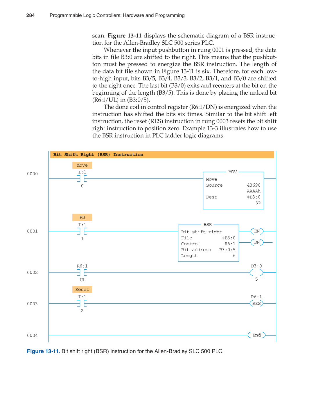 Figure 13-11. Bit shift right (BSR) instruction for the Allen-Bradley SLC 500 PLC.