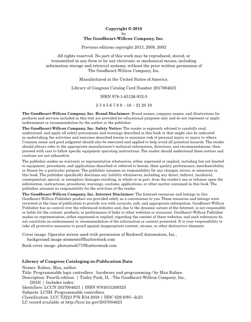 Copyright © 2018 by The Goodheart-Willcox Company, Inc. Previous editions copyright 2013, 2009, 2002 All rights reserved. No part of this work may be reproduced, stored, or transmitted in any form or by any electronic or mechanical means, including information storage and retrieval systems, without the prior written permission of The Goodheart-Willcox Company, Inc. Manufactured in the United States of America. Library of Congress Catalog Card Number 2017004623 ISBN 978-1-63126-932-5 2 3 4 5 6 7 8 9 – 18 – 21 20 19 The Goodheart-Willcox Company, Inc. Brand Disclaimer: Brand names, company names, and illustrations for products and services included in this text are provided for educational purposes only and do not represent or imply endorsement or recommendation by the author or the publisher. The Goodheart-Willcox Company, Inc. Safety Notice: The reader is expressly advised to carefully read, understand, and apply all safety precautions and warnings described in this book or that might also be indicated in undertaking the activities and exercises described herein to minimize risk of personal injury or injury to others. Common sense and good judgment should also be exercised and applied to help avoid all potential hazards. The reader should always refer to the appropriate manufacturer’s technical information, directions, and recommendations then proceed with care to follow specifi c equipment operating instructions. The reader should understand these notices and cautions are not exhaustive. The publisher makes no warranty or representation whatsoever, either expressed or implied, including but not limited to equipment, procedures, and applications described or referred to herein, their quality, performance, merchantability, or fi tness for a particular purpose. The publisher assumes no responsibility for any changes, errors, or omissions in this book. The publisher specifi cally disclaims any liability whatsoever, including any direct, indirect, incidental, consequential, special, or exemplary damages resulting, in whole or in part, from the reader’s use or reliance upon the information, instructions, procedures, warnings, cautions, applications, or other matter contained in this book. The publisher assumes no responsibility for the activities of the reader. The Goodheart-Willcox Company, Inc. Internet Disclaimer: The Internet resources and listings in this Goodheart-Willcox Publisher product are provided solely as a convenience to you. These resources and listings were reviewed at the time of publication to provide you with accurate, safe, and appropriate information. Goodheart-Willcox Publisher has no control over the referenced websites and, due to the dynamic nature of the Internet, is not responsible or liable for the content, products, or performance of links to other websites or resources. Goodheart-Willcox Publisher makes no representation, either expressed or implied, regarding the content of these websites, and such references do not constitute an endorsement or recommendation of the information or content presented. It is your responsibility to take all protective measures to guard against inappropriate content, viruses, or other destructive elements. Cover image: Operator screen used with permission of Rockwell Automation, Inc. background image momente/Shutterstock.com Back cover image: photostock77/Shutterstock.com Library of Congress Cataloging-in-Publication Data Names: Rabiee, Max, author. Title: Programmable logic controllers : hardware and programming / by Max Rabiee. Description: Fourth edition. | Tinley Park, IL : The Goodheart-Willcox Company, Inc., [2018] | Includes index. Identifiers: LCCN 2017004623 | ISBN 9781631269325 Subjects: LCSH: Programmable controllers. Classification: LCC TJ223.P76 R34 2018 | DDC 629.8/95--dc23 LC record available at http://lccn.loc.gov/2017004623