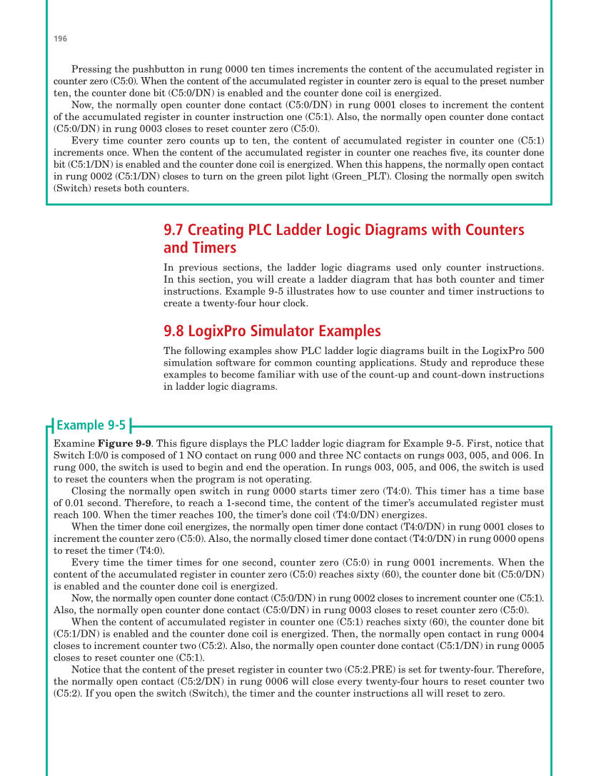 Copyright Goodheart-Willcox Co., Inc. 196 9.7 Creating PLC Ladder Logic Diagrams with Counters and Timers In previous sections, the ladder logic diagrams used only counter instructions. In this section, you will create a ladder diagram that has both counter and timer instructions. Example 9-5 illustrates how to use counter and timer instructions to create a twenty-four hour clock. 9.8 LogixPro Simulator Examples The following examples show PLC ladder logic diagrams built in the LogixPro 500 simulation software for common counting applications. Study and reproduce these examples to become familiar with use of the count-up and count-down instructions in ladder logic diagrams. Examine Figure 9-9. This fi gure displays the PLC ladder logic diagram for Example 9-5. First, notice that fi Switch I:0/0 is composed of 1 NO contact on rung 000 and three NC contacts on rungs 003, 005, and 006. In rung 000, the switch is used to begin and end the operation. In rungs 003, 005, and 006, the switch is used to reset the counters when the program is not operating. Closing the normally open switch in rung 0000 starts timer zero (T4:0). This timer has a time base of 0.01 second. Therefore, to reach a 1-second time, the content of the timer’s accumulated register must reach 100. When the timer reaches 100, the timer’s done coil (T4:0/DN) energizes. When the timer done coil energizes, the normally open timer done contact (T4:0/DN) in rung 0001 closes to increment the counter zero (C5:0). Also, the normally closed timer done contact (T4:0/DN) in rung 0000 opens to reset the timer (T4:0). Every time the timer times for one second, counter zero (C5:0) in rung 0001 increments. When the content of the accumulated register in counter zero (C5:0) reaches sixty (60), the counter done bit (C5:0/DN) is enabled and the counter done coil is energized. Now, the normally open counter done contact (C5:0/DN) in rung 0002 closes to increment counter one (C5:1). Also, the normally open counter done contact (C5:0/DN) in rung 0003 closes to reset counter zero (C5:0). When the content of accumulated register in counter one (C5:1) reaches sixty (60), the counter done bit (C5:1/DN) is enabled and the counter done coil is energized. Then, the normally open contact in rung 0004 closes to increment counter two (C5:2). Also, the normally open counter done contact (C5:1/DN) in rung 0005 closes to reset counter one (C5:1). Notice that the content of the preset register in counter two (C5:2.PRE) is set for twenty-four. Therefore, the normally open contact (C5:2/DN) in rung 0006 will close every twenty-four hours to reset counter two (C5:2). If you open the switch (Switch), the timer and the counter instructions all will reset to zero. Example 9-5 Pressing the pushbutton in rung 0000 ten times increments the content of the accumulated register in counter zero (C5:0). When the content of the accumulated register in counter zero is equal to the preset number ten, the counter done bit (C5:0/DN) is enabled and the counter done coil is energized. Now, the normally open counter done contact (C5:0/DN) in rung 0001 closes to increment the content of the accumulated register in counter instruction one (C5:1). Also, the normally open counter done contact (C5:0/DN) in rung 0003 closes to reset counter zero (C5:0). Every time counter zero counts up to ten, the content of accumulated register in counter one (C5:1) increments once. When the content of the accumulated register in counter one reaches five, its counter done fi bit (C5:1/DN) is enabled and the counter done coil is energized. When this happens, the normally open contact in rung 0002 (C5:1/DN) closes to turn on the green pilot light (Green_PLT). Closing the normally open switch (Switch) resets both counters.