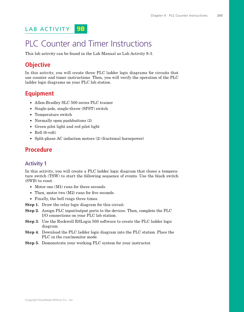 Copyright Goodheart-Willcox Co., Inc. Chapter 9 PLC Counter Instructions 205 L AB ACTIVIT Y 9B PLC Counter and Timer Instructions This lab activity can be found in the Lab Manual as Lab Activity 9-3. Objective In this activity, you will create three PLC ladder logic diagrams for circuits that use counter and timer instructions. Then, you will verify the operation of the PLC ladder logic diagrams on your PLC lab station. Equipment • Allen-Bradley SLC 500 series PLC trainer • Single-pole, single-throw (SPST) switch • Temperature switch • Normally open pushbuttons (2) • Green pilot light and red pilot light • Bell (6-volt) • Split-phase AC induction motors (2) (fractional horsepower) Procedure Activity 1 In this activity, you will create a PLC ladder logic diagram that closes a tempera- ture switch (TSW) to start the following sequence of events. Use the black switch (SWB) to reset. • Motor one (M1) runs for three seconds. • Then, motor two (M2) runs for five seconds. fi • Finally, the bell rings three times. Step 1. Draw the relay logic diagram for this circuit. Step 2. Assign PLC input/output ports to the devices. Then, complete the PLC I/O connections on your PLC lab station. Step 3. Use the Rockwell RSLogix 500 software to create the PLC ladder logic diagram. Step 4. Download the PLC ladder logic diagram into the PLC station. Place the PLC in the run/monitor mode. Step 5. Demonstrate your working PLC system for your instructor.