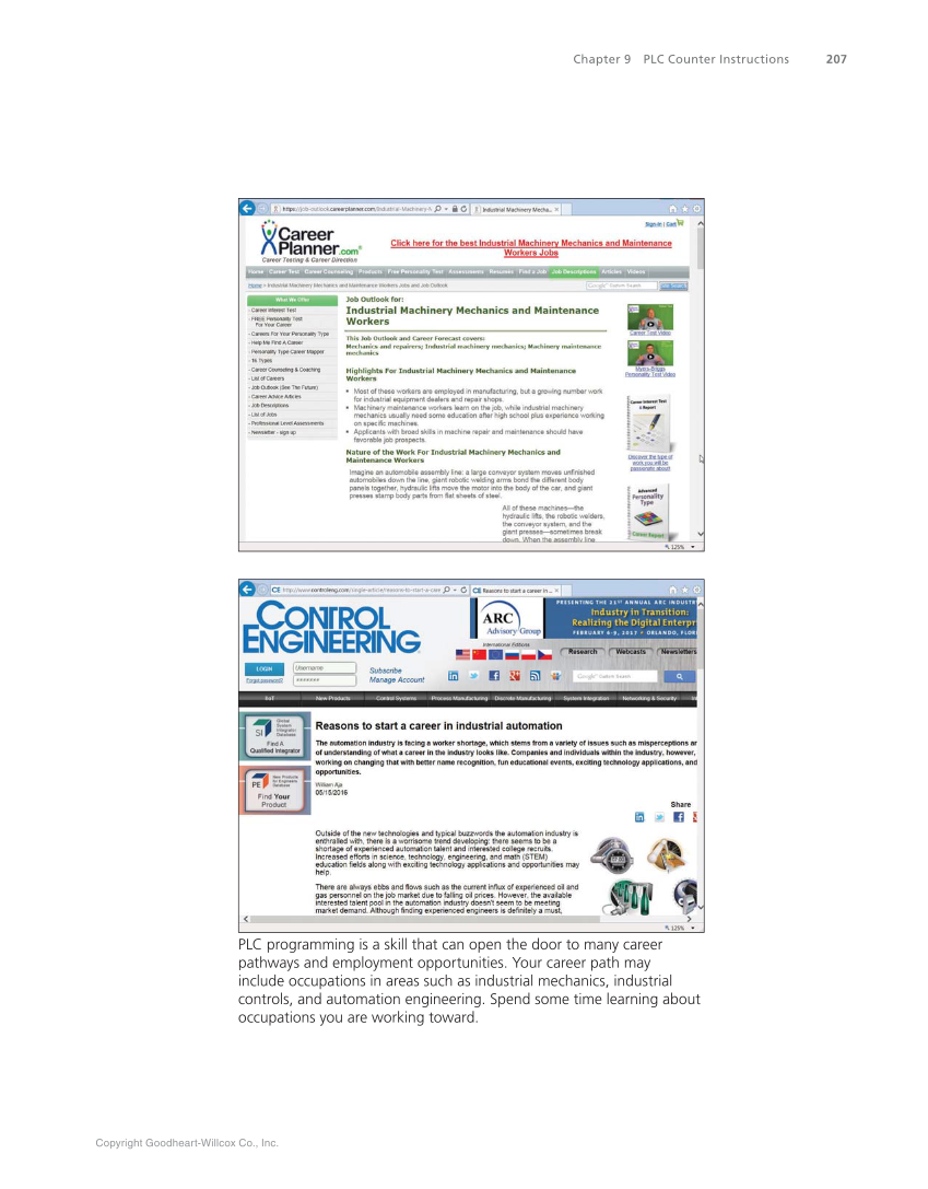 Copyright Goodheart-Willcox Co., Inc. Chapter 9 PLC Counter Instructions 207 PLC programming is a skill that can open the door to many career pathways and employment opportunities. Your career path may include occupations in areas such as industrial mechanics, industrial controls, and automation engineering. Spend some time learning about occupations you are working toward.