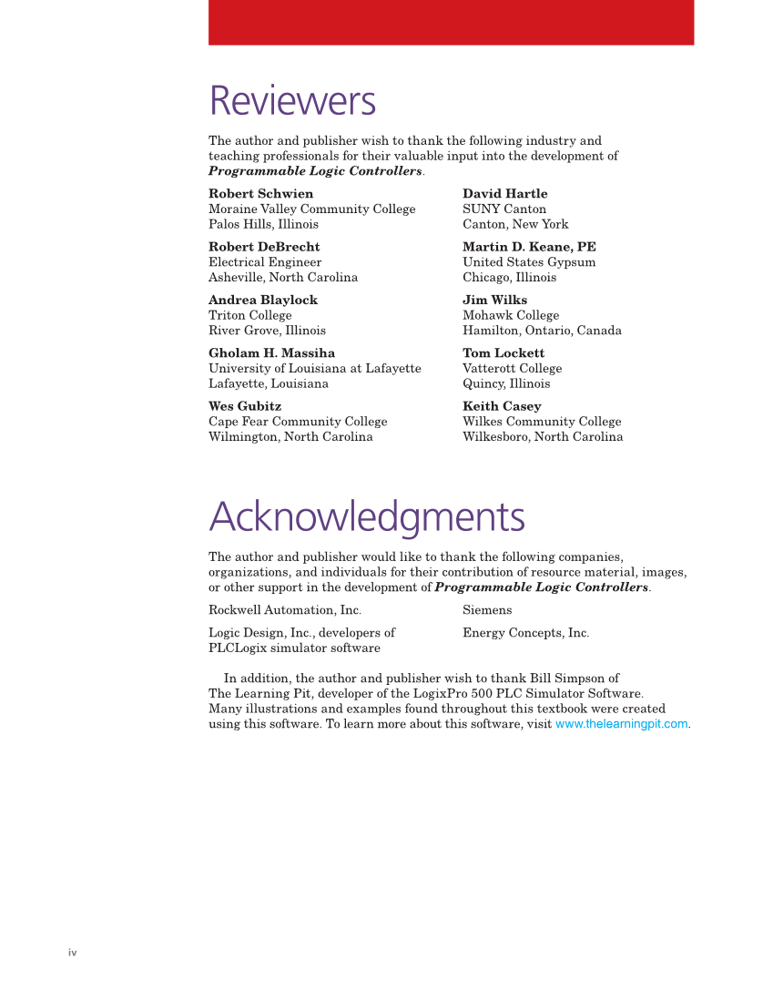 iv Reviewers The author and publisher wish to thank the following industry and teaching professionals for their valuable input into the development of Programmable Logic Controllers. Robert Schwien Moraine Valley Community College Palos Hills, Illinois Robert DeBrecht Electrical Engineer Asheville, North Carolina An drea Blaylock Triton College River Grove, Illinois Gholam H. Massiha University of Louisiana at Lafayette Lafayette, Louisiana Wes Gubitz Cape Fear Community College Wilmington, North Carolina David Hartle SUNY Canton Canton, New York Martin D. Keane, PE United States Gypsum Chicago, Illinois Jim Wilks Mohawk College Hamilton, Ontario, Canada Tom Lockett Vatterott College Quincy, Illinois Keith Casey Wilkes Community College Wilkesboro, North Carolina Acknowledgments The author and publisher would like to thank the following companies, organizations, and individuals for their contribution of resource material, images, or other support in the development of Programmable Logic Controllers. Rockwell Automation, Inc. Logic Design, Inc., developers of PLCLogix simulator software Siemens Energy Concepts, Inc. In addition, the author and publisher wish to thank Bill Simpson of The Learning Pit, developer of the LogixPro 500 PLC Simulator Software. Many illustrations and examples found throughout this textbook were created using this software. To learn more about this software, visit www.thelearningpit.com.