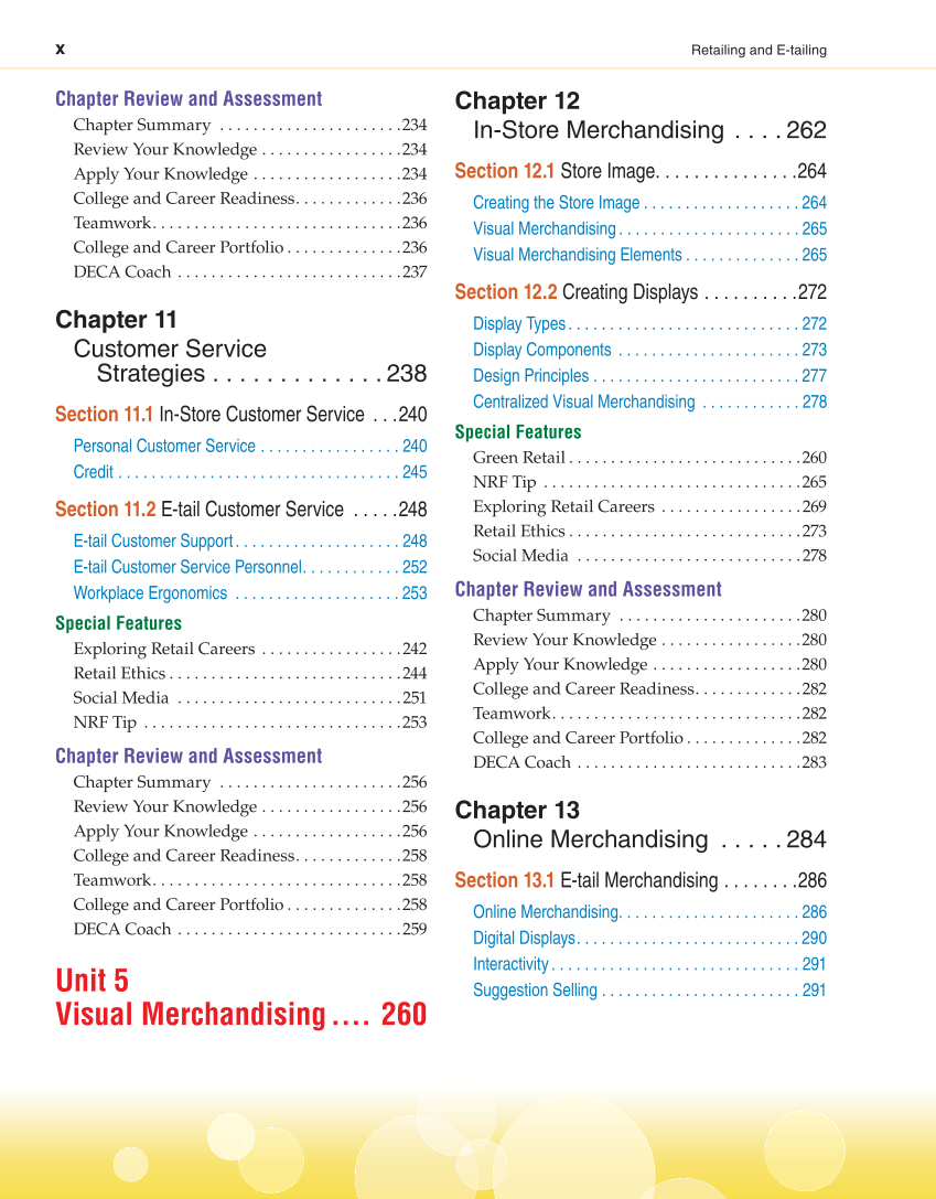 x Retailing and E-tailing Chapter Review and Assessment Chapter Summary . . . . . . . . . . . . . . . . . . . . . .234 Review Your Knowledge . . . . . . . . . . . . . . . . .234 Apply Your Knowledge . . . . . . . . . . . . . . . . . .234 College and Career Readiness. . . . . . . . . . . . .236 Teamwork. . . . . . . . . . . . . . . . . . . . . . . . . . . . . .236 College and Career Portfolio . . . . . . . . . . . . . .236 DECA Coach . . . . . . . . . . . . . . . . . . . . . . . . . . .237 Chapter 11 Customer Service Strategies . . . . . . . . . . . . . 238 Section 11.1 In-Store Customer Service . . .240 Personal Customer Service . . . . . . . . . . . . . . . . . 240 Credit . . . . . . . . . . . . . . . . . . . . . . . . . . . . . . . . . . 245 Section 11.2 E-tail Customer Service . . . . .248 E-tail Customer Support. . . . . . . . . . . . . . . . . . . . 248 E-tail Customer Service Personnel. . . . . . . . . . . . 252 Workplace Ergonomics . . . . . . . . . . . . . . . . . . . . 253 Special Features Exploring Retail Careers . . . . . . . . . . . . . . . . .242 Retail Ethics . . . . . . . . . . . . . . . . . . . . . . . . . . . .244 Social Media . . . . . . . . . . . . . . . . . . . . . . . . . . .251 NRF Tip . . . . . . . . . . . . . . . . . . . . . . . . . . . . . . .253 Chapter Review and Assessment Chapter Summary . . . . . . . . . . . . . . . . . . . . . .256 Review Your Knowledge . . . . . . . . . . . . . . . . .256 Apply Your Knowledge . . . . . . . . . . . . . . . . . .256 College and Career Readiness. . . . . . . . . . . . .258 Teamwork. . . . . . . . . . . . . . . . . . . . . . . . . . . . . .258 College and Career Portfolio . . . . . . . . . . . . . .258 DECA Coach . . . . . . . . . . . . . . . . . . . . . . . . . . .259 Unit 5 Visual Merchandising .... 260 Chapter 12 In-Store Merchandising . . . . 262 Section 12.1 Store Image. . . . . . . . . . . . . . .264 Creating the Store Image . . . . . . . . . . . . . . . . . . . 264 Visual Merchandising . . . . . . . . . . . . . . . . . . . . . . 265 Visual Merchandising Elements . . . . . . . . . . . . . . 265 Section 12.2 Creating Displays . . . . . . . . . .272 Display Types. . . . . . . . . . . . . . . . . . . . . . . . . . . . 272 Display Components . . . . . . . . . . . . . . . . . . . . . . 273 Design Principles . . . . . . . . . . . . . . . . . . . . . . . . . 277 Centralized Visual Merchandising . . . . . . . . . . . . 278 Special Features Green Retail . . . . . . . . . . . . . . . . . . . . . . . . . . . .260 NRF Tip . . . . . . . . . . . . . . . . . . . . . . . . . . . . . . .265 Exploring Retail Careers . . . . . . . . . . . . . . . . .269 Retail Ethics . . . . . . . . . . . . . . . . . . . . . . . . . . . .273 Social Media . . . . . . . . . . . . . . . . . . . . . . . . . . .278 Chapter Review and Assessment Chapter Summary . . . . . . . . . . . . . . . . . . . . . .280 Review Your Knowledge . . . . . . . . . . . . . . . . .280 Apply Your Knowledge . . . . . . . . . . . . . . . . . .280 College and Career Readiness. . . . . . . . . . . . .282 Teamwork. . . . . . . . . . . . . . . . . . . . . . . . . . . . . .282 College and Career Portfolio . . . . . . . . . . . . . .282 DECA Coach . . . . . . . . . . . . . . . . . . . . . . . . . . .283 Chapter 13 Online Merchandising . . . . . 284 Section 13.1 E-tail Merchandising . . . . . . . .286 Online Merchandising. . . . . . . . . . . . . . . . . . . . . . 286 Digital Displays. . . . . . . . . . . . . . . . . . . . . . . . . . . 290 Interactivity . . . . . . . . . . . . . . . . . . . . . . . . . . . . . . 291 Suggestion Selling . . . . . . . . . . . . . . . . . . . . . . . . 291
