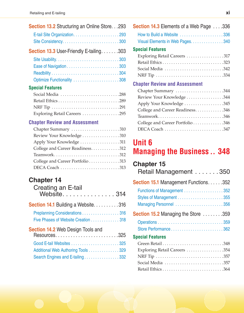 xi Retailing and E-tailing Section 13.2 Structuring an Online Store. . .293 E-tail Site Organization. . . . . . . . . . . . . . . . . . . . . 293 Site Consistency. . . . . . . . . . . . . . . . . . . . . . . . . . 300 Section 13.3 User-Friendly E-tailing. . . . . . .303 Site Usability. . . . . . . . . . . . . . . . . . . . . . . . . . . . . 303 Ease of Navigation . . . . . . . . . . . . . . . . . . . . . . . . 303 Readbility . . . . . . . . . . . . . . . . . . . . . . . . . . . . . . . 304 Optimize Functionality . . . . . . . . . . . . . . . . . . . . . 308 Special Features Social Media . . . . . . . . . . . . . . . . . . . . . . . . . . .288 Retail Ethics . . . . . . . . . . . . . . . . . . . . . . . . . . . .289 NRF Tip . . . . . . . . . . . . . . . . . . . . . . . . . . . . . . . 291 Exploring Retail Careers . . . . . . . . . . . . . . . . .295 Chapter Review and Assessment Chapter Summary . . . . . . . . . . . . . . . . . . . . . . 310 Review Your Knowledge . . . . . . . . . . . . . . . . . 310 Apply Your Knowledge . . . . . . . . . . . . . . . . . . 311 College and Career Readiness. . . . . . . . . . . . . 312 Teamwork. . . . . . . . . . . . . . . . . . . . . . . . . . . . . . 312 College and Career Portfolio . . . . . . . . . . . . . . 313 DECA Coach . . . . . . . . . . . . . . . . . . . . . . . . . . . 313 Chapter 14 Creating an E-tail Website. . . . . . . . . . . . . . . 314 Section 14.1 Building a Website. . . . . . . . . .316 Preplanning Considerations . . . . . . . . . . . . . . . . . 316 Five Phases of Website Creation . . . . . . . . . . . . . 318 Section 14.2 Web Design Tools and Resources. . . . . . . . . . . . . . . . . . . . . . . . .325 Good E-tail Websites . . . . . . . . . . . . . . . . . . . . . . 325 Additional Web Authoring Tools . . . . . . . . . . . . . . 329 Search Engines and E-tailing . . . . . . . . . . . . . . . . 332 Section 14.3 Elements of a Web Page . . . .336 How to Build a Website . . . . . . . . . . . . . . . . . . . . 336 Visual Elements in Web Pages. . . . . . . . . . . . . . . 340 Special Features Exploring Retail Careers . . . . . . . . . . . . . . . . . 317 Retail Ethics . . . . . . . . . . . . . . . . . . . . . . . . . . . .323 Social Media . . . . . . . . . . . . . . . . . . . . . . . . . . .342 NRF Tip . . . . . . . . . . . . . . . . . . . . . . . . . . . . . . .334 Chapter Review and Assessment Chapter Summary . . . . . . . . . . . . . . . . . . . . . .344 Review Your Knowledge . . . . . . . . . . . . . . . . .344 Apply Your Knowledge . . . . . . . . . . . . . . . . . .345 College and Career Readiness. . . . . . . . . . . . .346 Teamwork. . . . . . . . . . . . . . . . . . . . . . . . . . . . . .346 College and Career Portfolio . . . . . . . . . . . . . .346 DECA Coach . . . . . . . . . . . . . . . . . . . . . . . . . . .347 Unit 6 Managing the Business .. 348 Chapter 15 Retail Management . . . . . . . 350 Section 15.1 Management Functions. . . . . .352 Functions of Management . . . . . . . . . . . . . . . . . . 352 Styles of Management . . . . . . . . . . . . . . . . . . . . . 355 Managing Personnel . . . . . . . . . . . . . . . . . . . . . . 356 Section 15.2 Managing the Store . . . . . . . .359 Operations . . . . . . . . . . . . . . . . . . . . . . . . . . . . . . 359 Store Performance . . . . . . . . . . . . . . . . . . . . . . . . 362 Special Features Green Retail . . . . . . . . . . . . . . . . . . . . . . . . . . . .348 Exploring Retail Careers . . . . . . . . . . . . . . . . .354 NRF Tip . . . . . . . . . . . . . . . . . . . . . . . . . . . . . . .357 Social Media . . . . . . . . . . . . . . . . . . . . . . . . . . .357 Retail Ethics . . . . . . . . . . . . . . . . . . . . . . . . . . . .364