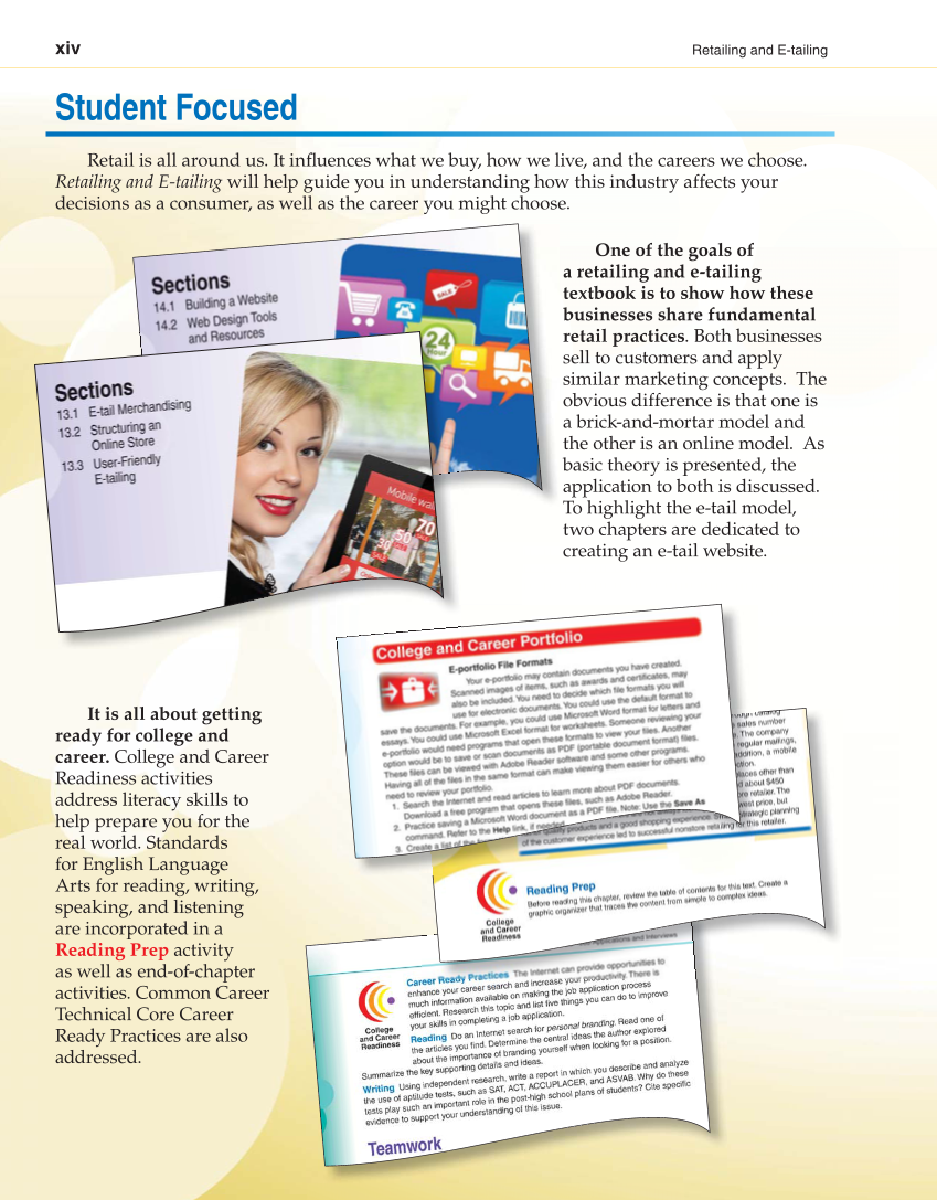 xiv Retailing and E-tailing Retail is all around us. It infl uences what we buy, how we live, and the careers we choose. Retailing and E-tailing will help guide you in understanding how this industry affects your decisions as a consumer, as well as the career you might choose. One of the goals of a retailing and e-tailing textbook is to show how these businesses share fundamental retail practices. Both businesses sell to customers and apply similar marketing concepts. The obvious difference is that one is a brick-and-mortar model and the other is an online model. As basic theory is presented, the application to both is discussed. To highlight the e-tail model, two chapters are dedicated to creating an e-tail website. It is all about getting ready for college and career. College and Career Readiness activities address literacy skills to help prepare you for the real world. Standards for English Language Arts for reading, writing, speaking, and listening are incorporated in a Reading Prep activity as well as end-of-chapter activities. Common Career Technical Core Career Ready Practices are also addressed. Student Focused