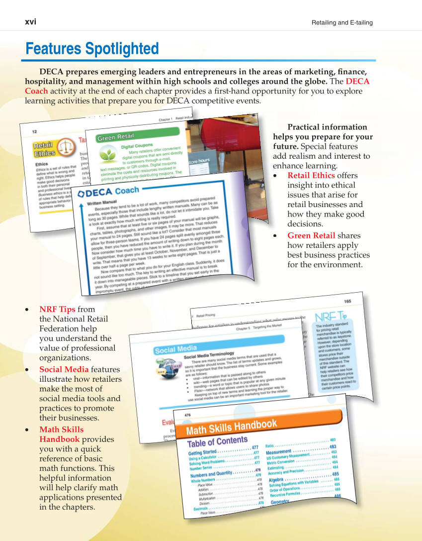 xvi Retailing and E-tailing DECA prepares emerging leaders and entrepreneurs in the areas of marketing, fi nance, hospitality, and management within high schools and colleges around the globe. The DECA Coach activity at the end of each chapter provides a fi rst-hand opportunity for you to explore learning activities that prepare you for DECA competitive events. Features Spotlighted Practical information helps you prepare for your future. Special features add realism and interest to enhance learning. • Retail Ethics offers insight into ethical issues that arise for retail businesses and how they make good decisions. • Green Retail shares how retailers apply best business practices for the environment. • NRF Tips from the National Retail Federation help you understand the value of professional organizations. • Social Media features illustrate how retailers make the most of social media tools and practices to promote their businesses. • Math Skills Handbook provides you with a quick reference of basic math functions. This helpful information will help clarify math applications presented in the chapters. h f a e • •