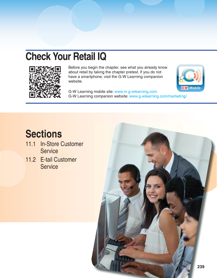 239 Before you begin the chapter, see what you already know about retail by taking the chapter pretest. If you do not have a smartphone, visit the G-W Learning companion website. G-W Learning mobile site: www.m.g-wlearning.com G-W Learning companion website: www.g-wlearning.com/marketing/ 239 Sections 11.1 In-Store Customer Service 11.2 E-tail Customer Service wavebreakmedia/Shutterstock.com Check Your Retail IQ