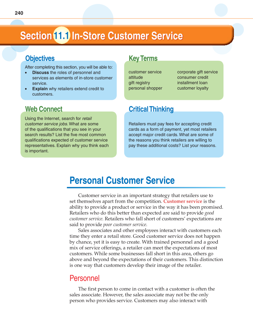 240 Key Terms Objectives Critical Thinking Web Connect Section In-Store Customer Service 11.1 After completing this section, you will be able to: • Discuss the roles of personnel and services as elements of in-store customer service. • Explain why retailers extend credit to customers. customer service attitude gift registry personal shopper corporate gift service consumer credit installment loan customer loyalty Using the Internet, search for retail customer service jobs. What are some of the qualifi cations that you see in your search results? List the fi ve most common qualifi cations expected of customer service representatives. Explain why you think each is important. Retailers must pay fees for accepting credit cards as a form of payment, yet most retailers accept major credit cards. What are some of the reasons you think retailers are willing to pay these additional costs? List your reasons. Personal Customer Service Customer service in an important strategy that retailers use to set themselves apart from the competition. Customer service is the ability to provide a product or service in the way it has been promised. Retailers who do this better than expected are said to provide good customer service. Retailers who fall short of customers’ expectations are said to provide poor customer service. Sales associates and other employees interact with customers each time they enter a retail store. Good customer service does not happen by chance, yet it is easy to create. With trained personnel and a good mix of service offerings, a retailer can meet the expectations of most customers. While some businesses fall short in this area, others go above and beyond the expectations of their customers. This distinction is one way that customers develop their image of the retailer. Personnel The fi rst person to come in contact with a customer is often the sales associate. However, the sales associate may not be the only person who provides service. Customers may also interact with