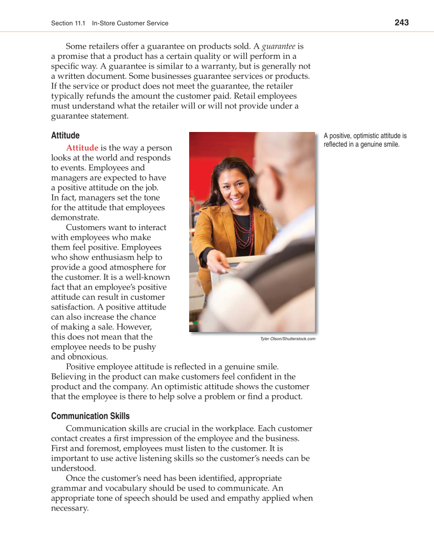 243 Section 11.1 In-Store Customer Service Some retailers offer a guarantee on products sold. A guarantee is a promise that a product has a certain quality or will perform in a specifi c way. A guarantee is similar to a warranty, but is generally not a written document. Some businesses guarantee services or products. If the service or product does not meet the guarantee, the retailer typically refunds the amount the customer paid. Retail employees must understand what the retailer will or will not provide under a guarantee statement. Attitude Attitude is the way a person looks at the world and responds to events. Employees and managers are expected to have a positive attitude on the job. In fact, managers set the tone for the attitude that employees demonstrate. Customers want to interact with employees who make them feel positive. Employees who show enthusiasm help to provide a good atmosphere for the customer. It is a well-known fact that an employee’s positive attitude can result in customer satisfaction. A positive attitude can also increase the chance of making a sale. However, this does not mean that the employee needs to be pushy and obnoxious. Positive employee attitude is refl ected in a genuine smile. Believing in the product can make customers feel confi dent in the product and the company. An optimistic attitude shows the customer that the employee is there to help solve a problem or fi nd a product. Communication Skills Communication skills are crucial in the workplace. Each customer contact creates a fi rst impression of the employee and the business. First and foremost, employees must listen to the customer. It is important to use active listening skills so the customer’s needs can be understood. Once the customer’s need has been identifi ed, appropriate grammar and vocabulary should be used to communicate. An appropriate tone of speech should be used and empathy applied when necessary. A positive, optimistic attitude is refl ected in a genuine smile. Tyler Olson/Shutterstock.com