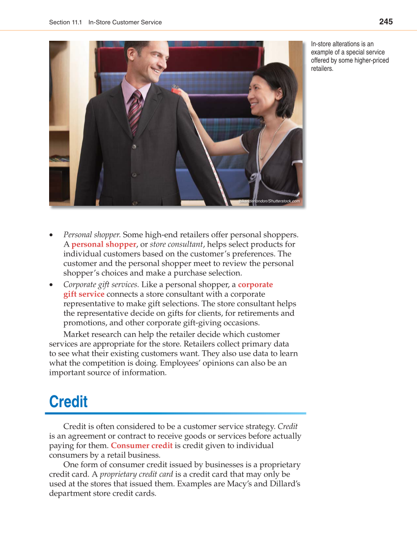 245 Section 11.1 In-Store Customer Service • Personal shopper. Some high-end retailers offer personal shoppers. A personal shopper, or store consultant, helps select products for individual customers based on the customer’s preferences. The customer and the personal shopper meet to review the personal shopper’s choices and make a purchase selection. • Corporate gift services. Like a personal shopper, a corporate gift service connects a store consultant with a corporate representative to make gift selections. The store consultant helps the representative decide on gifts for clients, for retirements and promotions, and other corporate gift-giving occasions. Market research can help the retailer decide which customer services are appropriate for the store. Retailers collect primary data to see what their existing customers want. They also use data to learn what the competition is doing. Employees’ opinions can also be an important source of information. Credit Credit is often considered to be a customer service strategy. Credit is an agreement or contract to receive goods or services before actually paying for them. Consumer credit is credit given to individual consumers by a retail business. One form of consumer credit issued by businesses is a proprietary credit card. A proprietary credit card is a credit card that may only be used at the stores that issued them. Examples are Macy’s and Dillard’s department store credit cards. In-store alterations is an example of a special service offered by some higher-priced retailers. bikeriderlondon/Shutterstock.com