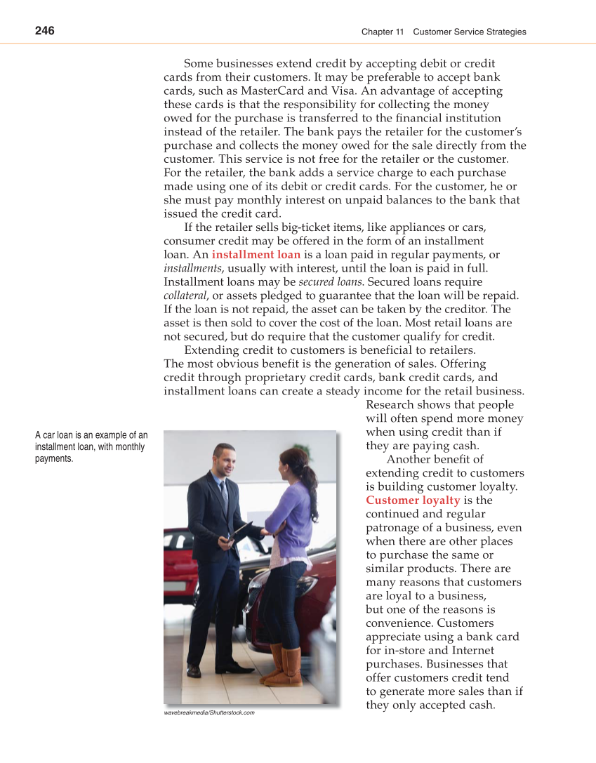 246 Chapter 11 Customer Service Strategies Some businesses extend credit by accepting debit or credit cards from their customers. It may be preferable to accept bank cards, such as MasterCard and Visa. An advantage of accepting these cards is that the responsibility for collecting the money owed for the purchase is transferred to the fi nancial institution instead of the retailer. The bank pays the retailer for the customer’s purchase and collects the money owed for the sale directly from the customer. This service is not free for the retailer or the customer. For the retailer, the bank adds a service charge to each purchase made using one of its debit or credit cards. For the customer, he or she must pay monthly interest on unpaid balances to the bank that issued the credit card. If the retailer sells big-ticket items, like appliances or cars, consumer credit may be offered in the form of an installment loan. An installment loan is a loan paid in regular payments, or installments, usually with interest, until the loan is paid in full. Installment loans may be secured loans. Secured loans require collateral, or assets pledged to guarantee that the loan will be repaid. If the loan is not repaid, the asset can be taken by the creditor. The asset is then sold to cover the cost of the loan. Most retail loans are not secured, but do require that the customer qualify for credit. Extending credit to customers is beneficial to retailers. The most obvious benefit is the generation of sales. Offering credit through proprietary credit cards, bank credit cards, and installment loans can create a steady income for the retail business. Research shows that people will often spend more money when using credit than if they are paying cash. Another benefi t of extending credit to customers is building customer loyalty. Customer loyalty is the continued and regular patronage of a business, even when there are other places to purchase the same or similar products. There are many reasons that customers are loyal to a business, but one of the reasons is convenience. Customers appreciate using a bank card for in-store and Internet purchases. Businesses that offer customers credit tend to generate more sales than if they only accepted cash. A car loan is an example of an installment loan, with monthly payments. wavebreakmedia/Shutterstock.com